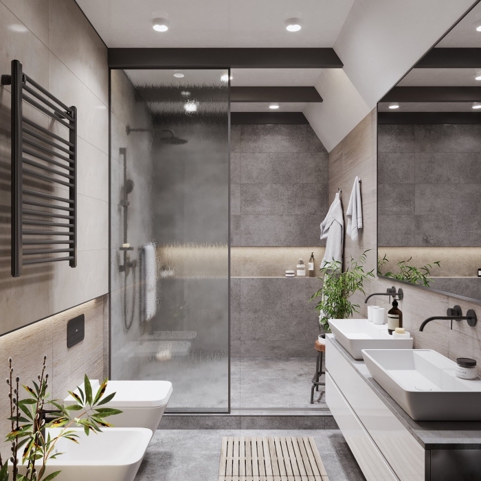 Belles prestations : Huisseries en aluminium, volets roulants électriques sur tous les châssis, carrelage en grès cérame émaillé 60 x 60 dans toutes les pièces, salles de bains équipées de meuble vasque, bandeaux lumineux, sèche-serviettes...