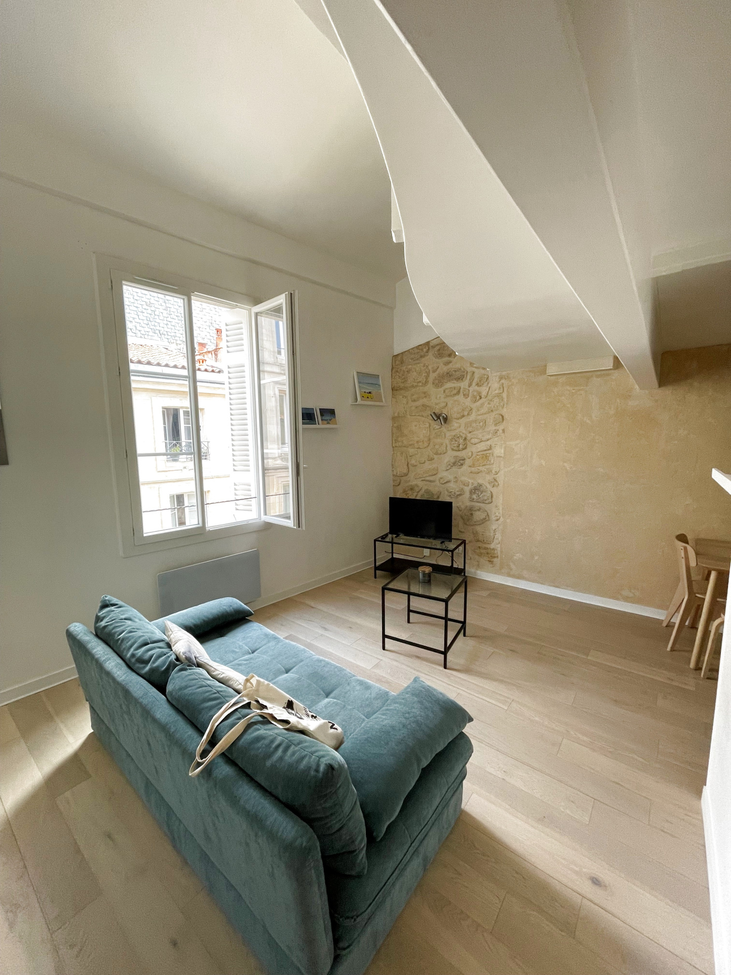 Dans un bel immeuble pierre parfaitement entretenu, situé au second et dernier étage, vous serez charmé par ce beau T3. Au coeur de Bordeaux mais dans une rue calme, lumineux, en parfait état, moderne tout en ayant conservé le charme de l'ancien, ce joli T3 en duplex se compose d'une entrée avec placards, une pièce de vie avec cuisine (meublée et équipée) et une salle de bains avec WC. A l'étage, un espace bureau et deux chambres. Une cave complète le bien.Copropriét de 3 lots - D.P.E.: C - Charges : 50,00 €/mois.