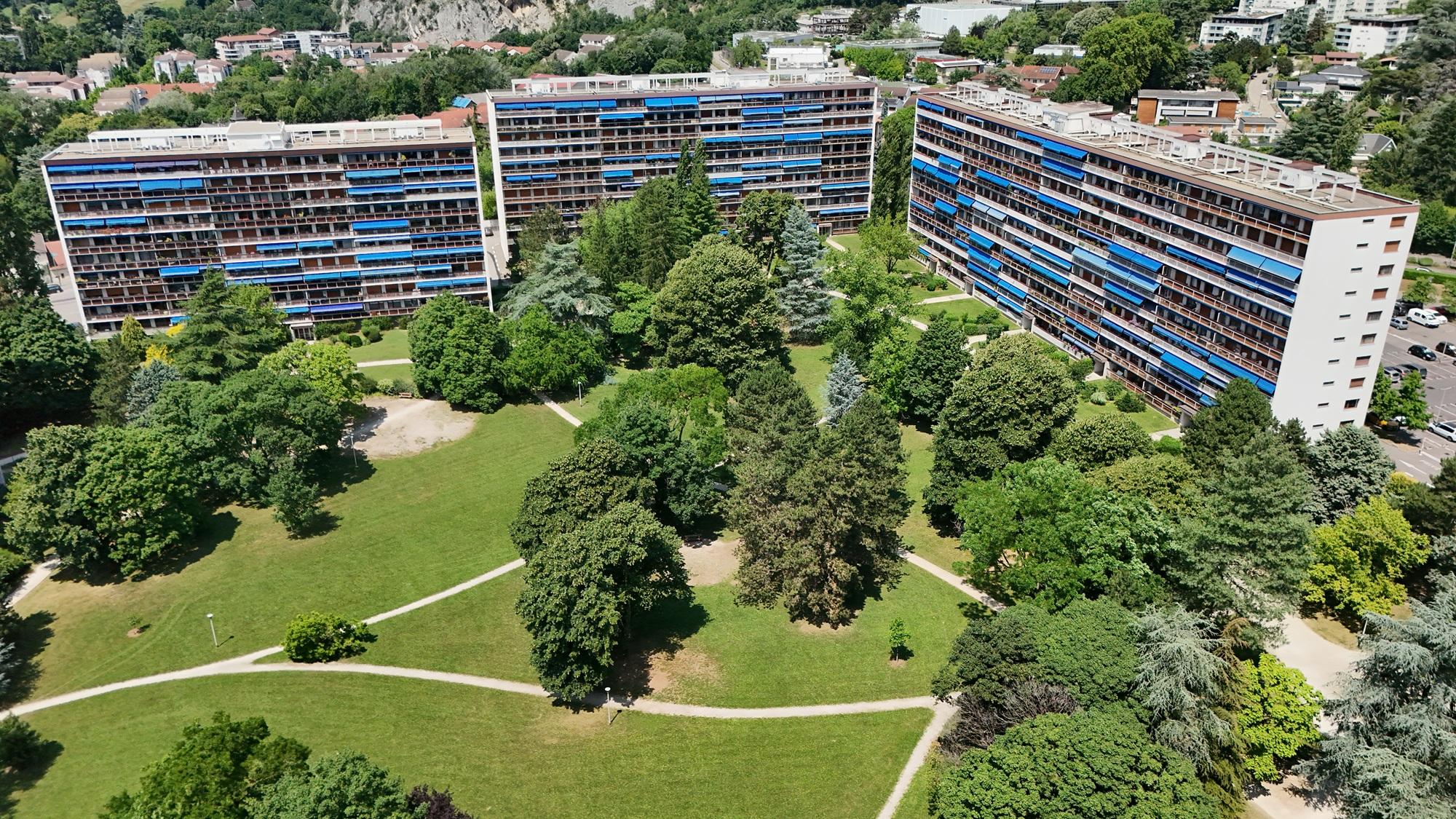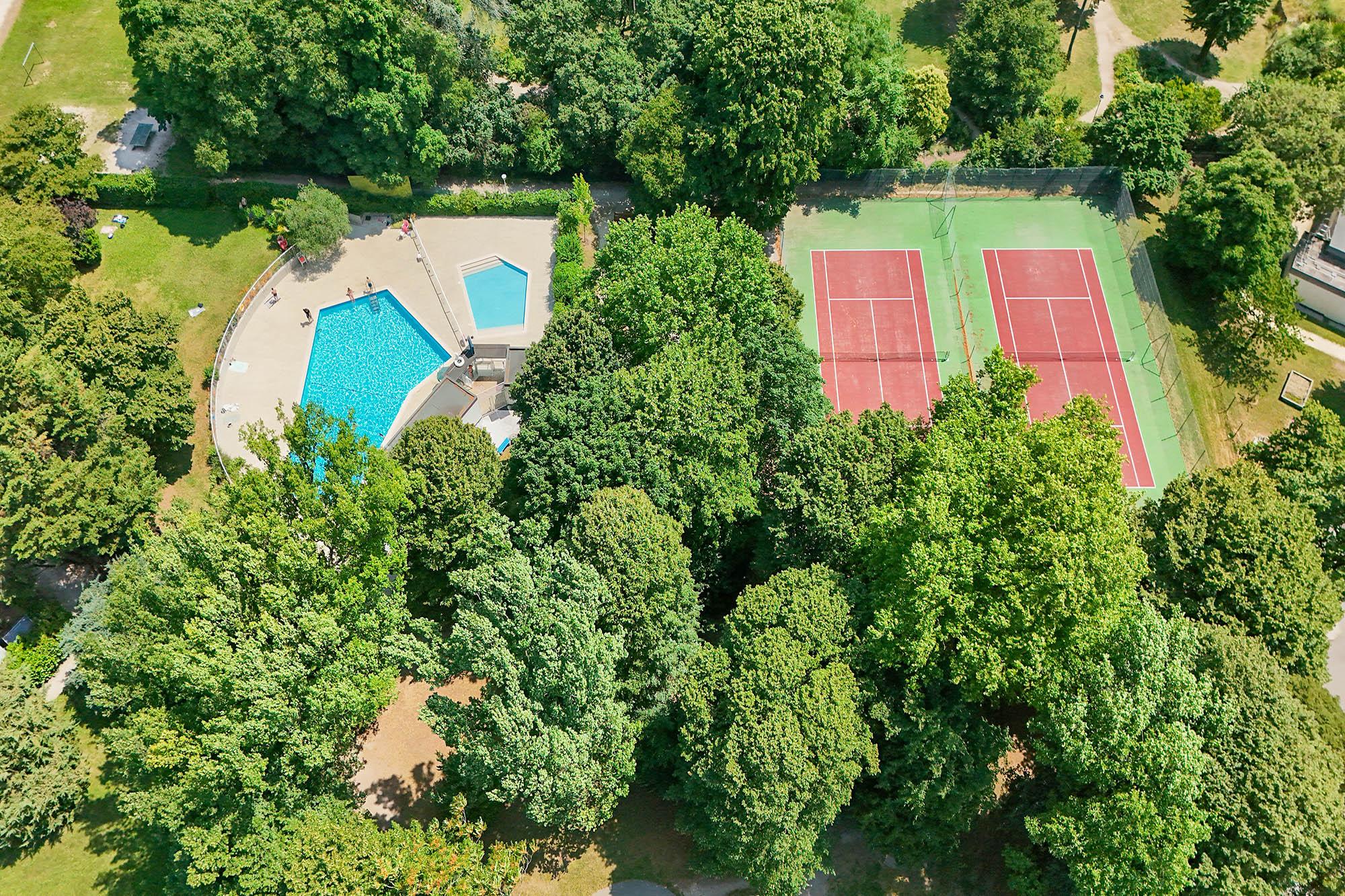 La résidence offre un cadre de vie privilégié avec un grand parc arboré, une piscine, des terrains de tennis et des aires de jeux pour enfants.