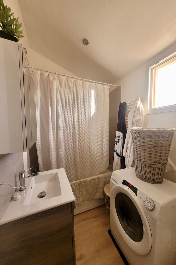 A l'étage, vous trouverez une salle de bains ainsi que la chambre.
