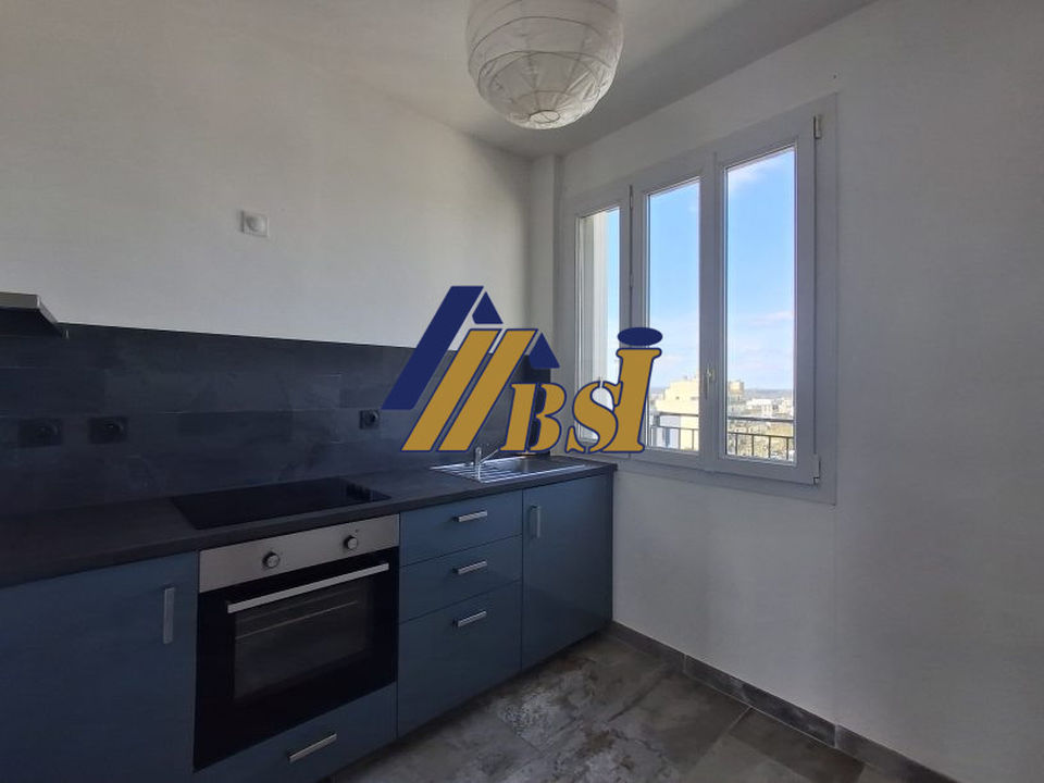 Cuisine aménagée et semi-équipée (plaques, four) ouverte sur espace à vivre accès balcon