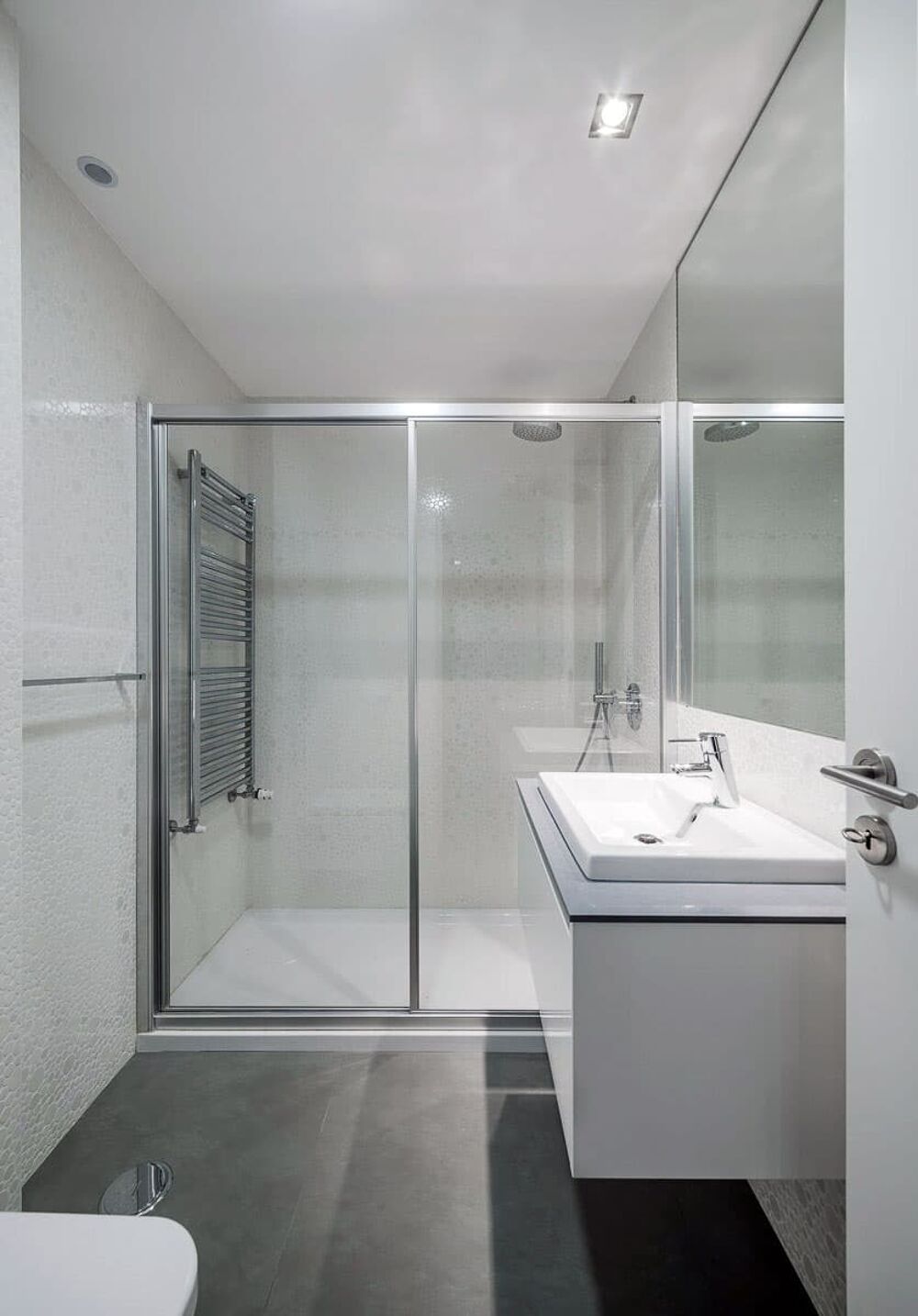 Finitions sur-mesure : grands carrelages grès cérame, peinture toile lisse, fenêtres levantes-coulissantes