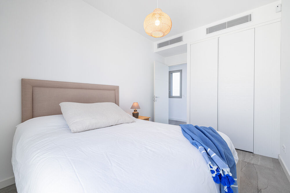 La suite principale, véritable écrin de douceur, s'ouvre sur une terrasse privée de 20 m², offrant un spectacle saisissant sur l'horizon azuréen.