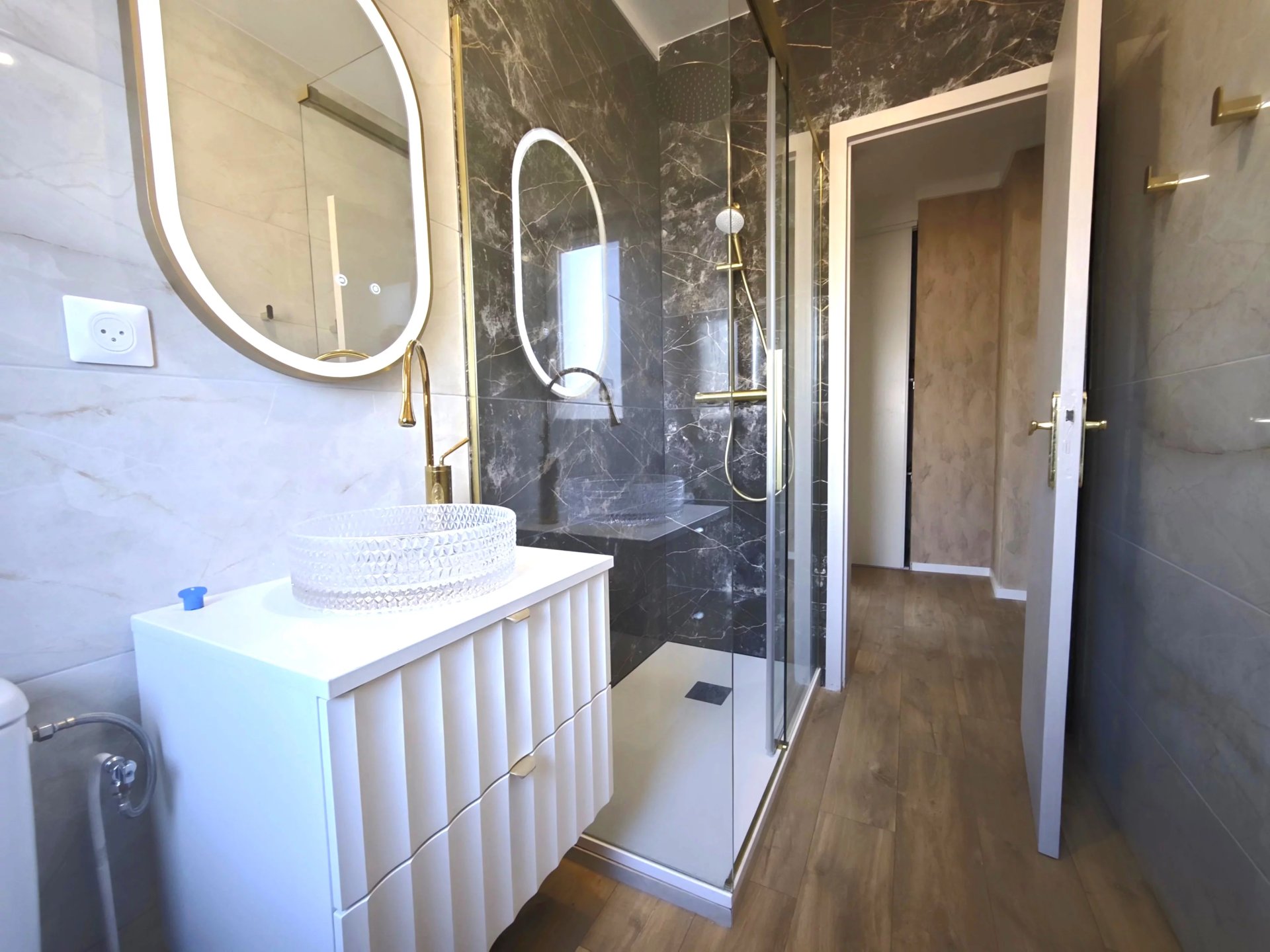 Une salle d'eau récemment rénovée avec douche design, meuble vasque et WC
