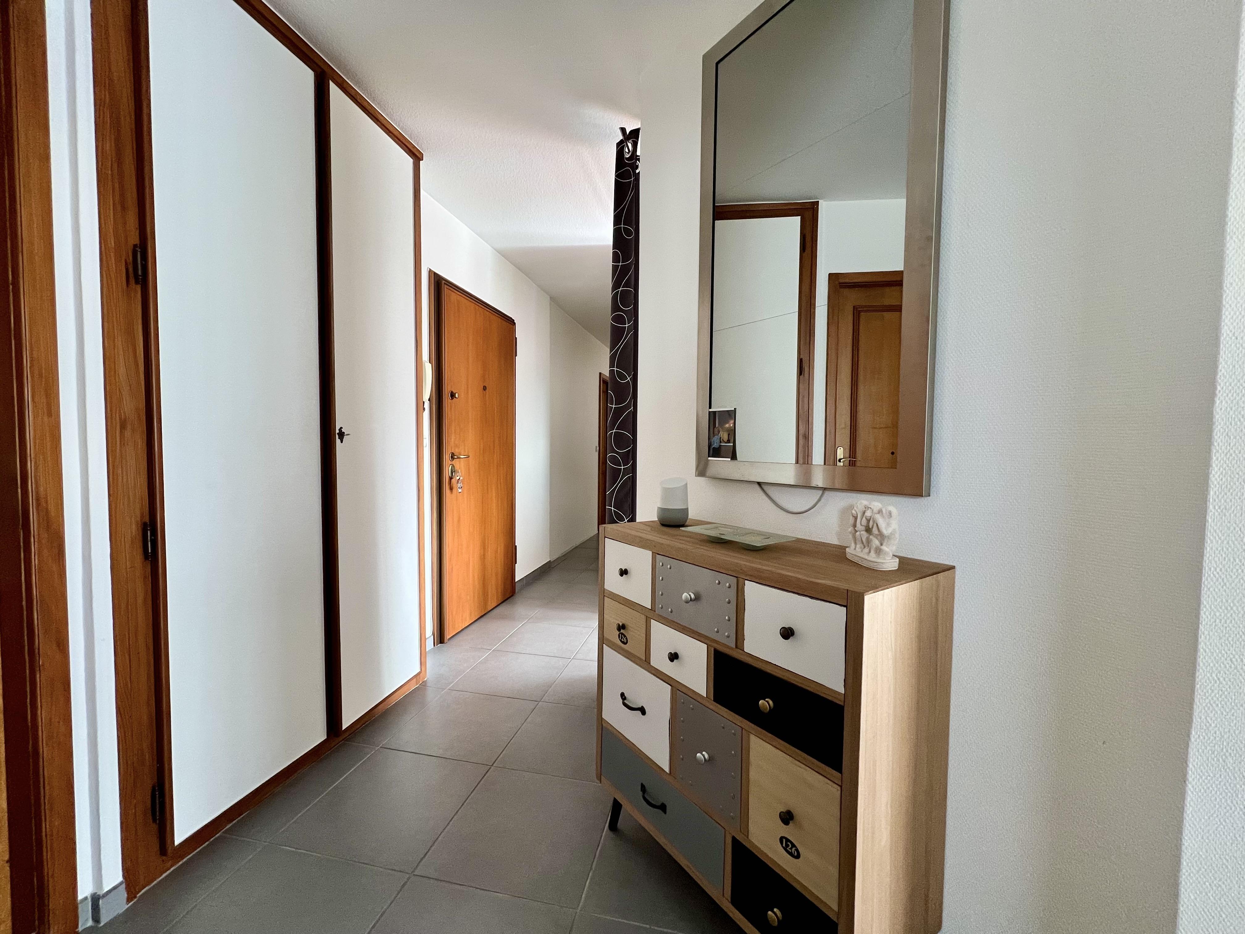 Un appartement lumineux, bien agencé, avec un élément central qui structure naturellement l'espace de vie.