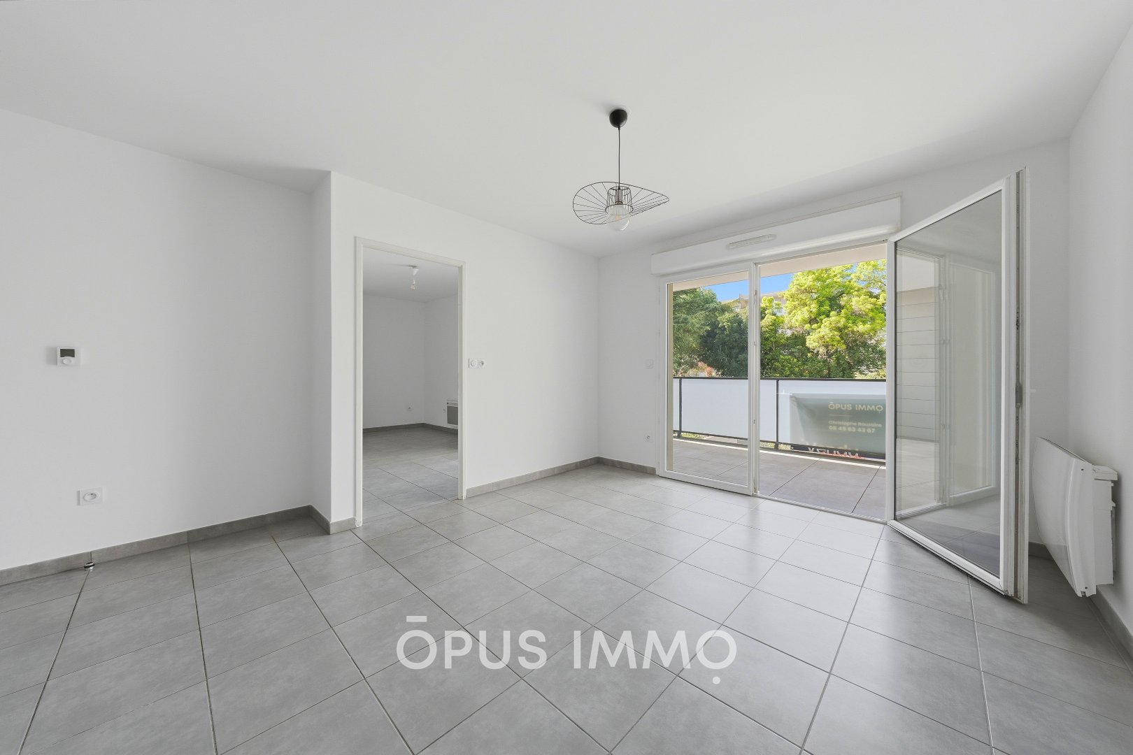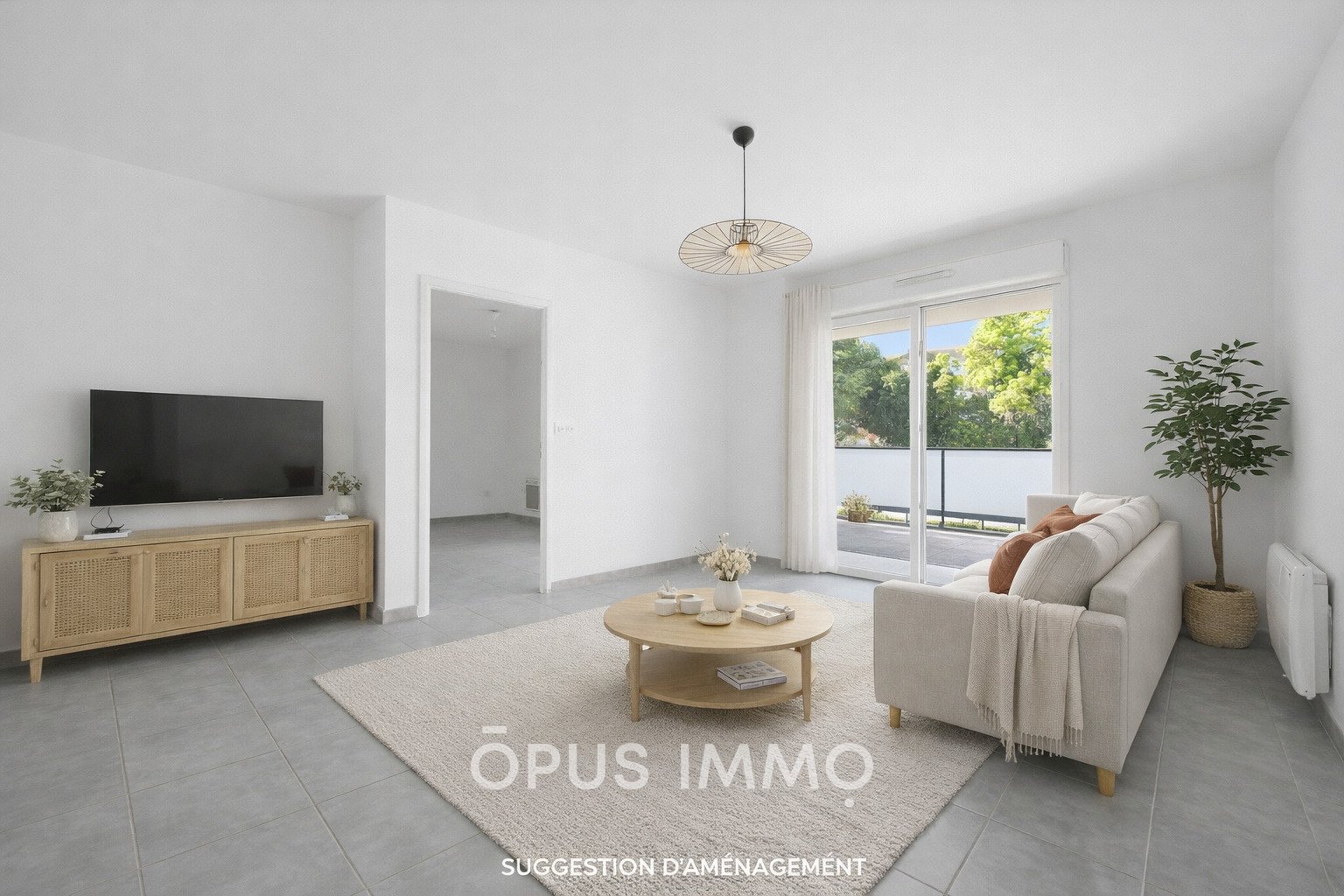 Séjour lumineux avec accès terrasse, cuisine équipée, chambre confortable, salle d'eau moderne.