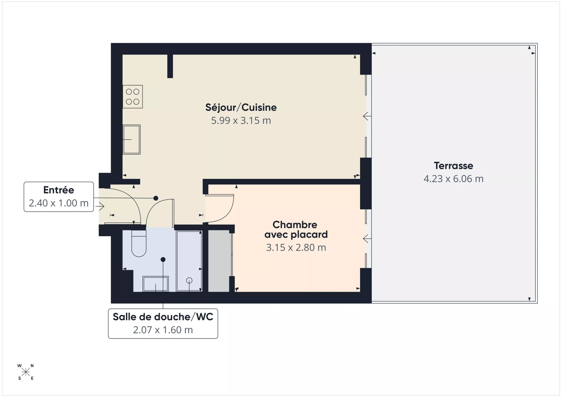 Il se compose d'un séjour/cuisine de 18.79m² ouvrant sur la grande terrasse, une chambre avec placard, une salle de douche avec WC.