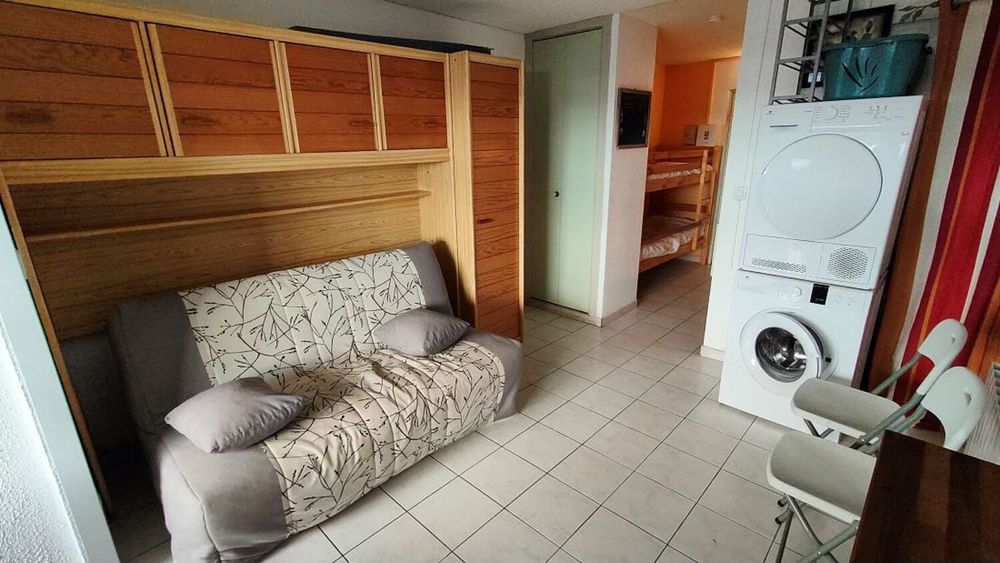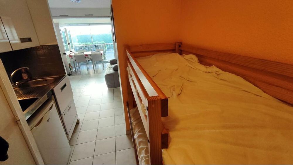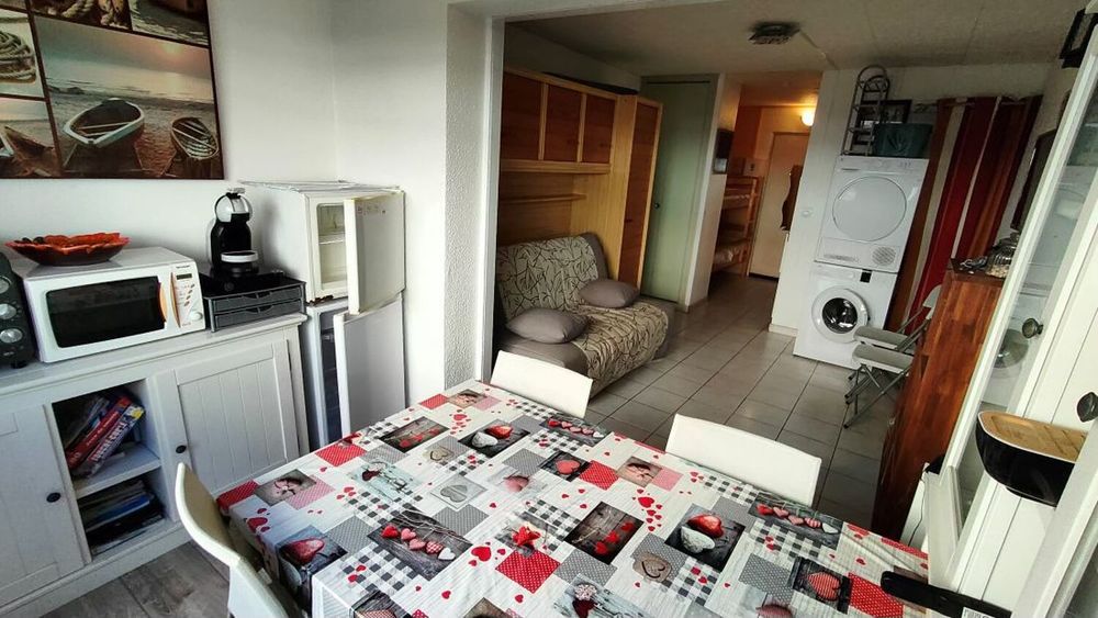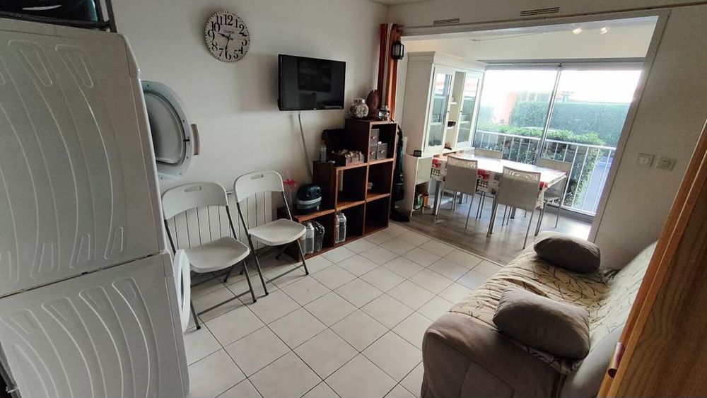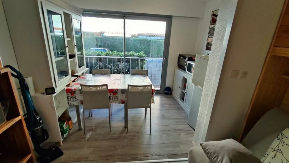 Le Cap d'Agde : Appartement situé proche plage de la Grande Conque: REZ DE CHAUSSEE: Comprenant: Entrée cabine ( 2 lits superposés), S/eau avec wc, coin cuisine équipé, séjour, loggia vitrée ( double vitrage neuf + volet électrique ) Surface utile 25m². Vendu meublé et équipé, habitable sans travaux! ( Faible charges de copropriété ) nombreux parkings gratuits à proximité. Nbre de lots en copropriété : 126 Lots - Charges de copropriété : 436€/an. Sauvegarde de copropriété : Néant. (Prix honoraires à la charge du vendeur). Energie : D/233 - GES B/9.* Prix net, hors frais notarié, d'enregistrement et de publicité foncière.