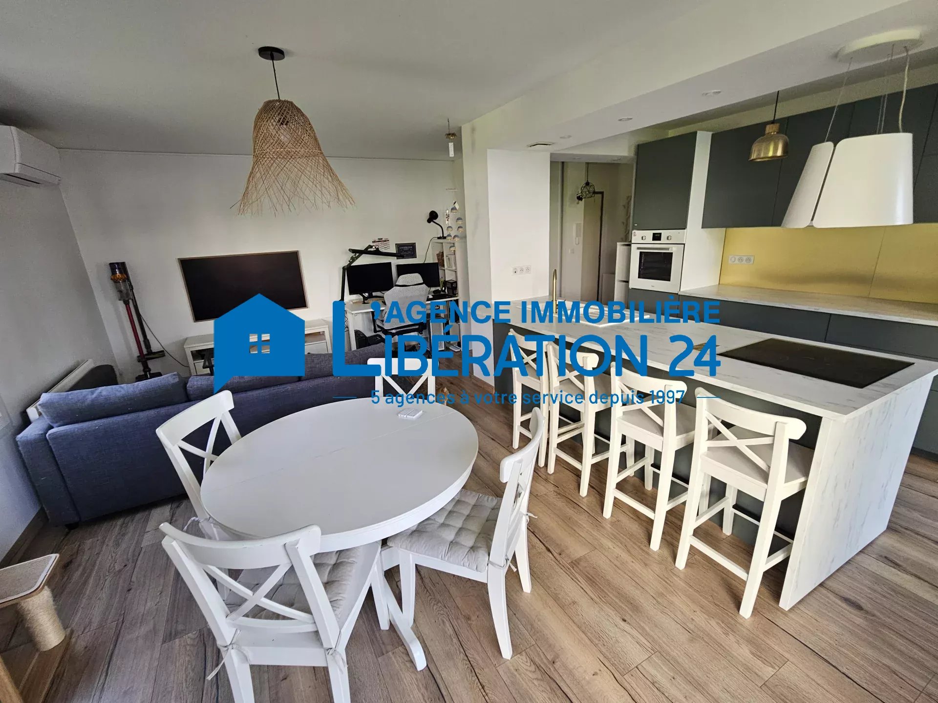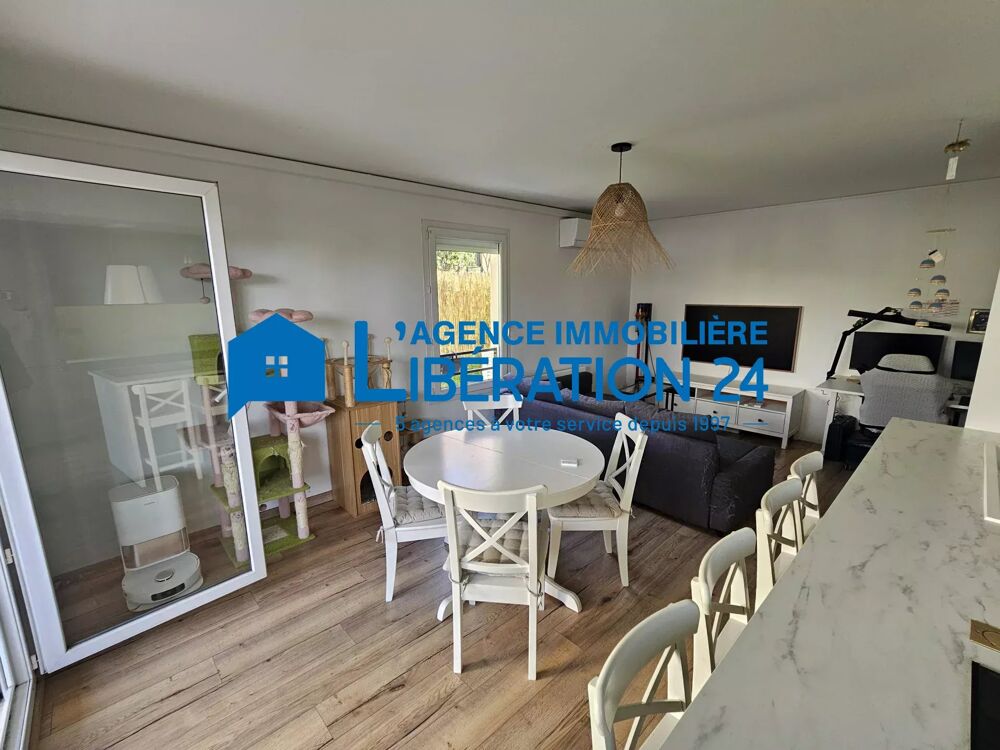 Moderne, il dispose d'une cuisine entièrement équipée ouverte sur le séjour et l'extérieur, 2 chambres de 10 et 11m², salle d'eau avec grande douche.
