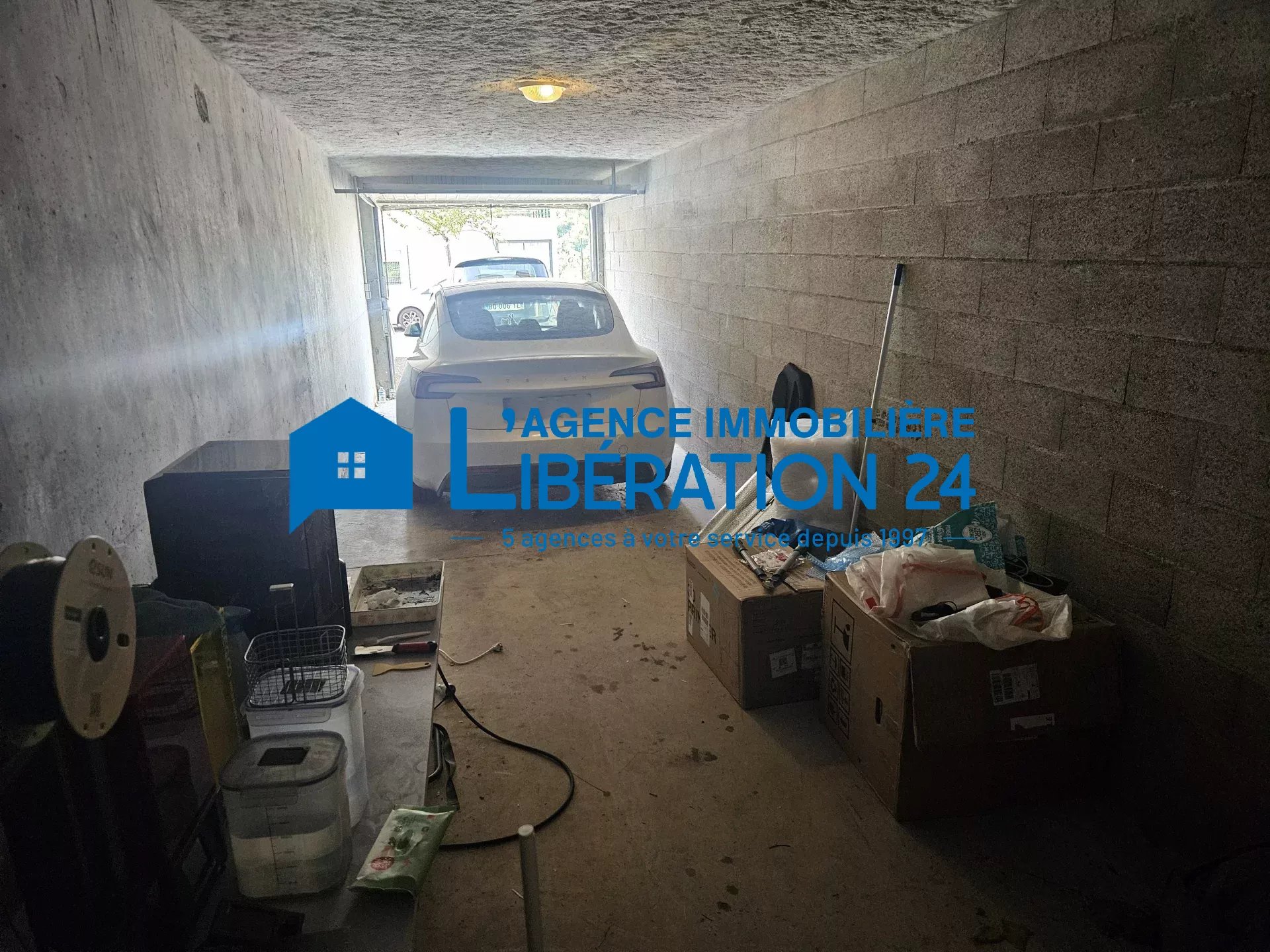 Grand garage double 30m² dans la résidence équipé d'une borne de chargement pour véhicule électrique.