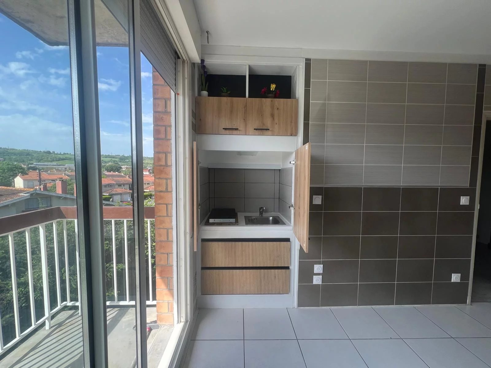 L'appartement se compose d'une entrée avec placard de rangement, d'une pièce à vivre lumineuse avec une kitchenette discrètement dissimulée dans un placard, ainsi que d'un grand balcon exposé est bénéficiant d'une vue dégagée.