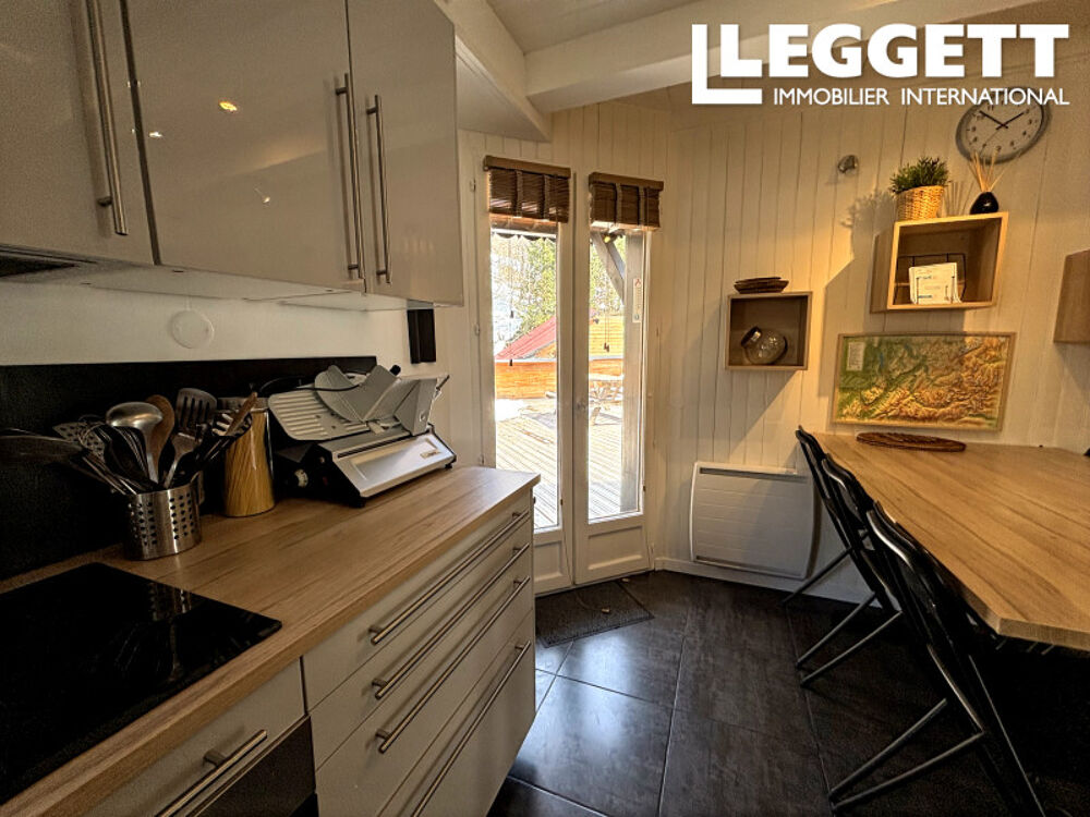 La cuisine est un espace remarquable : portes-fenêtres ouvrant sur la terrasse, très lumineuse, avec des rangements modernes et élégants, et ouverte sur le salon et la salle à manger.