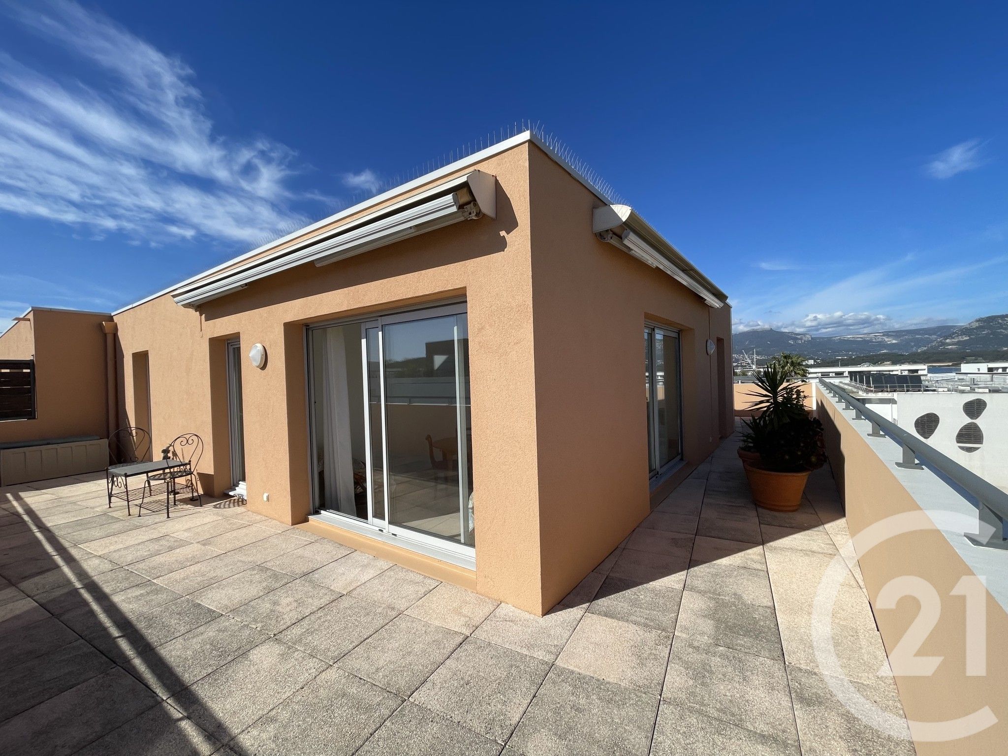 Nichée au dernier étage d'un immeuble sécurisé avec ascenseur, cet appartement de 72m² vous accueil dès l'entrée avec un espace fonctionnel. Cet appartement bénéficie d' une terrasse exceptionnelle de 84m². Le séjour s'ouvre sur cet espace extérieur, ainsi que la cuisine indépendante et les deux chambres de 10m² et 11m², une salle d'eau et un WC séparés complètent ce bel ensemble. Le bien est vendu habitable sans travaux, et comprend en plus un box en sous-sol, electrifié pour le stationnement ou le rangement. Prix : 330000.0 euros, Honoraires charge vendeur. Copropriété :Nb de lots : 150