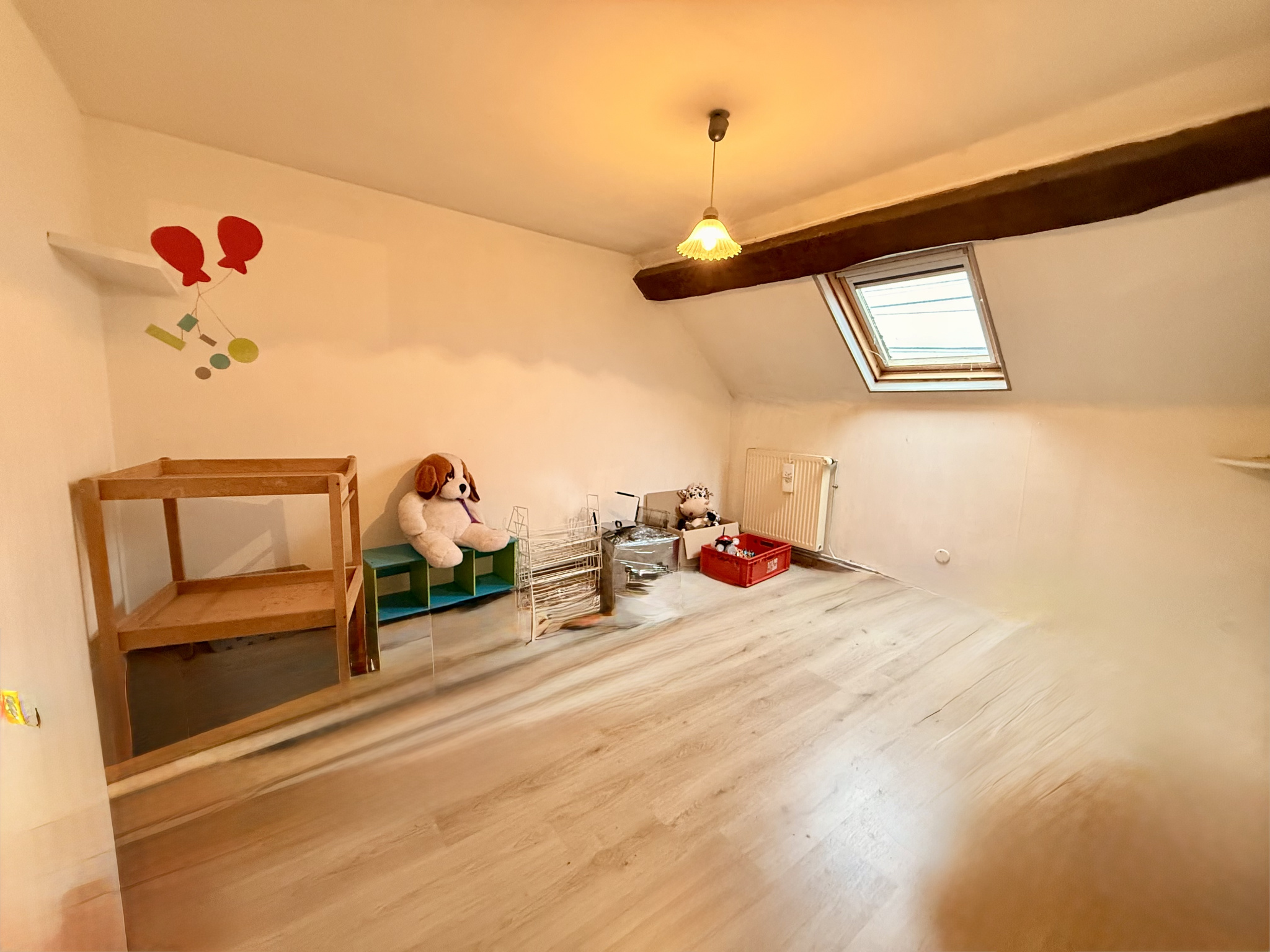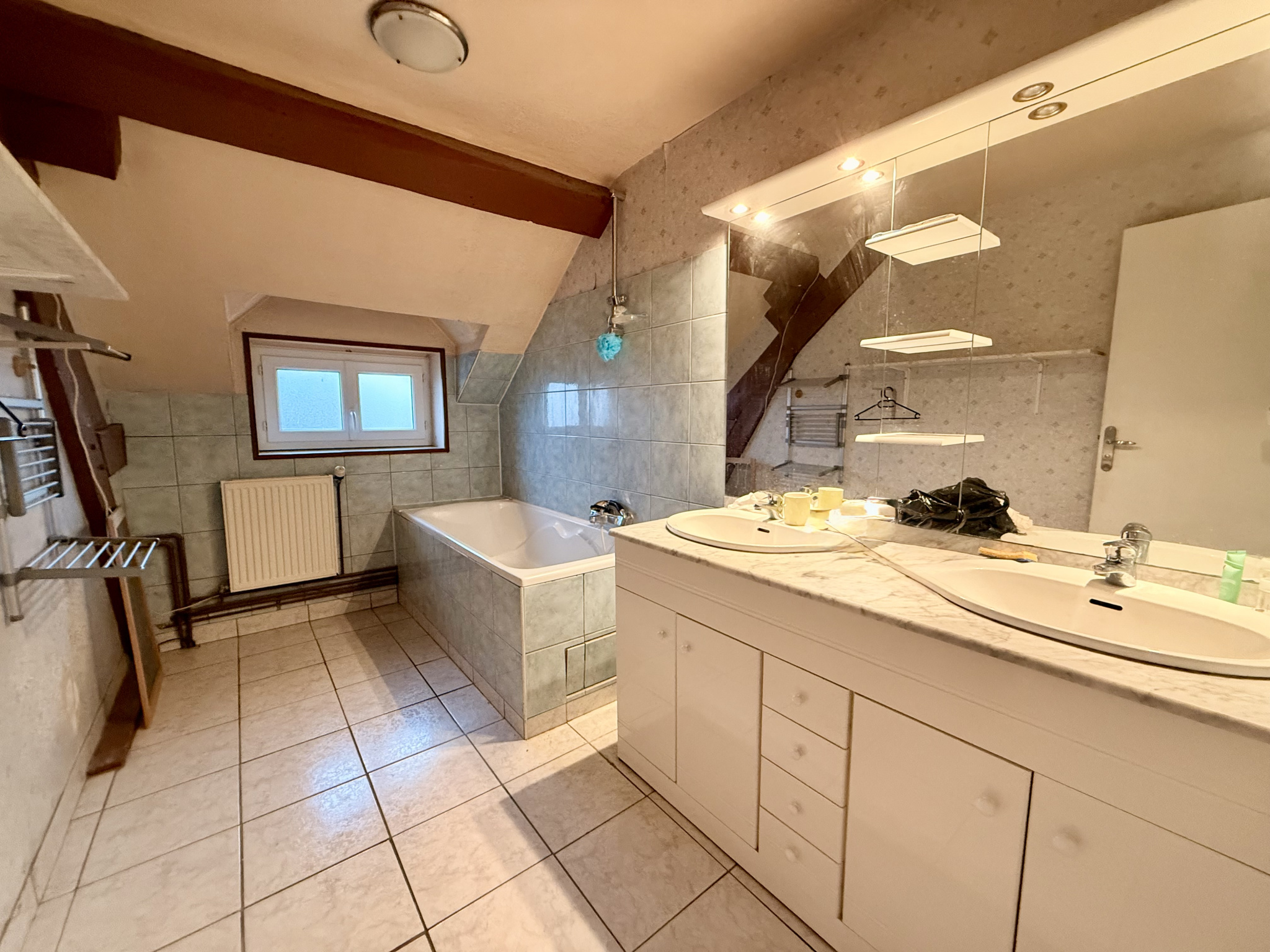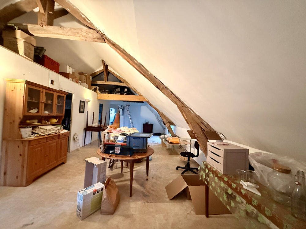 A l'étage, un appartement lumineux à rafraîchir, comprenant : une grande pièce de vie d'environ 36 m2 avec cuisine à créer, trois grandes chambres, un dressing ou bureau, une salle de bains, un WC séparé.