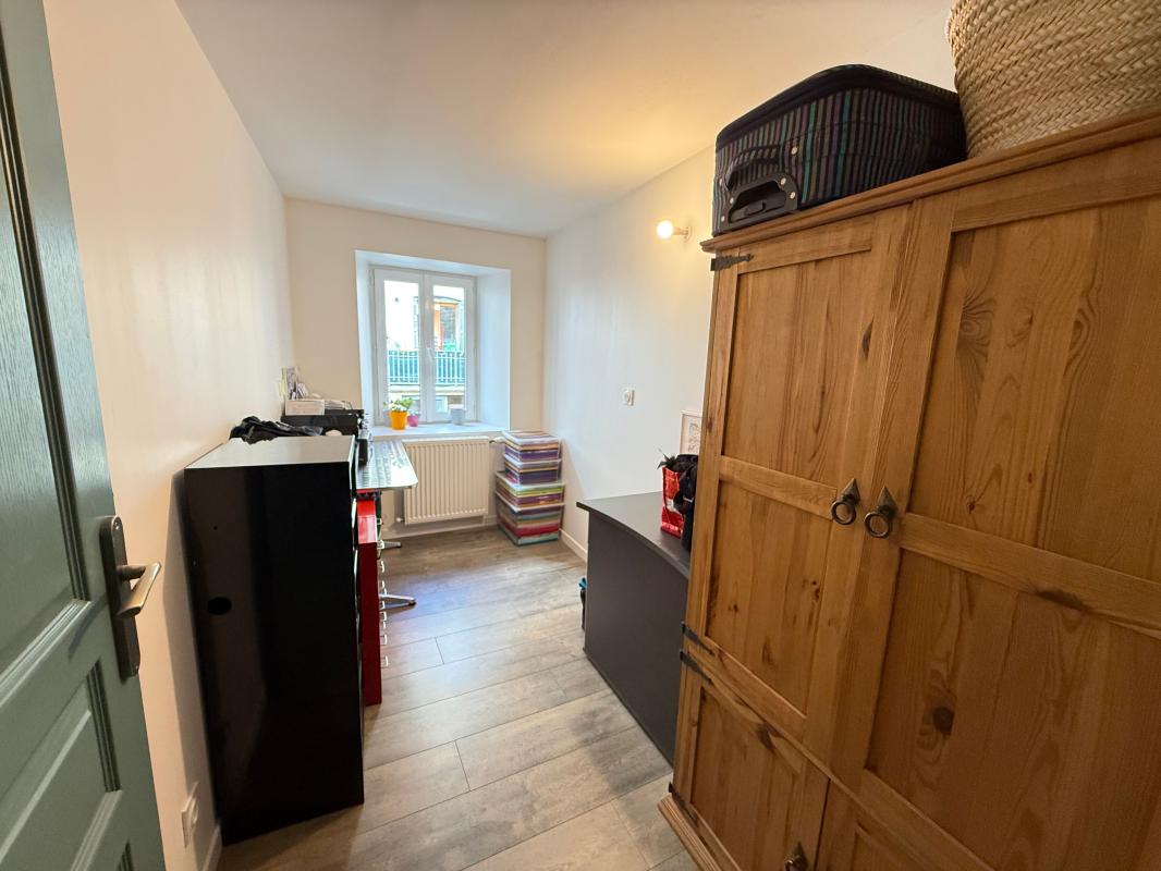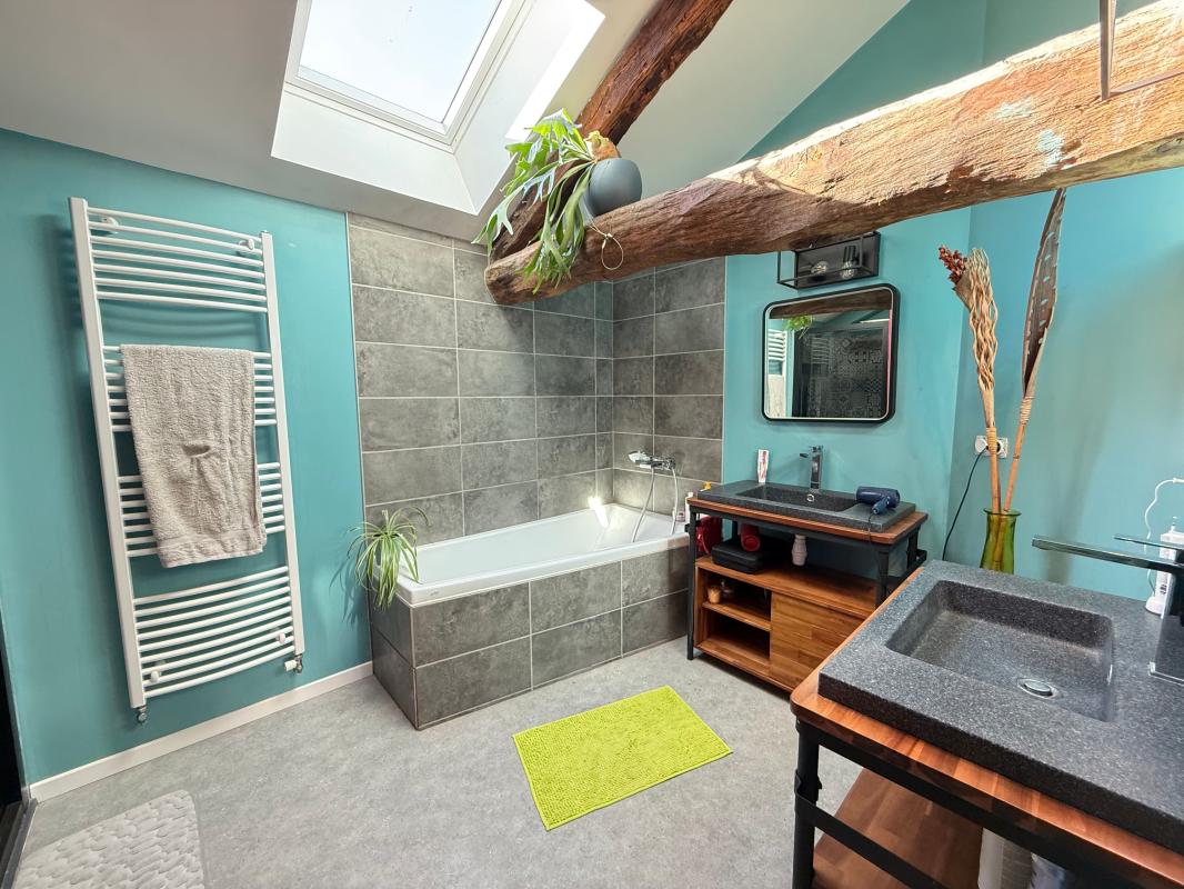 À l'étage supérieur, le caractère atypique du lieu se révèle pleinement. Un palier distribue une pièce de 8 m² pouvant faire office de chambre ou bureau, un WC indépendant, une salle de bains équipée à la fois d'une douche et d'une baignoire, ainsi qu'une chambre supplémentaire. Mais la véritable pièce maîtresse reste le spectaculaire séjour de 50 m², baigné de lumière, dont la charpente apparente et les volumes hors normes confèrent au lieu une atmosphère unique. Un renfoncement du séjour accueille un point d'eau avec rangements, idéal pour aménager un coin bar pensé pour recevoir et partager.