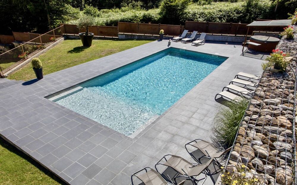 Piscine 12m x 5m, en dur carrelee, large terrasse tout autour, securisee.