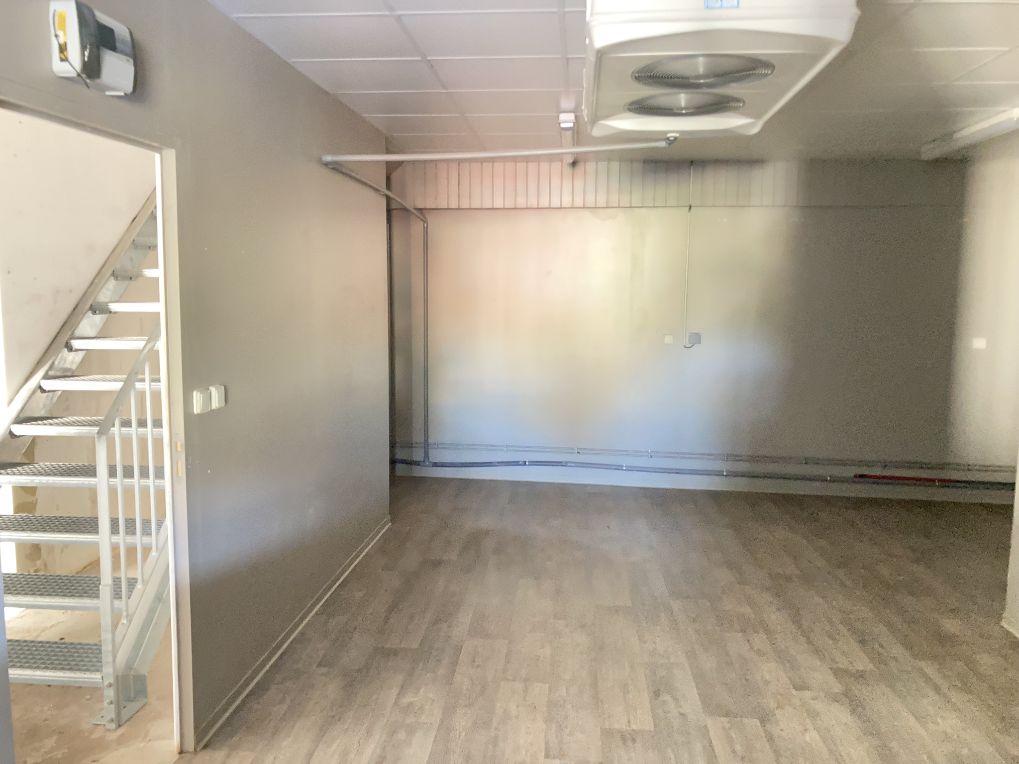 Porche, local commercial, arrière cuisine/remise, 1 pièce aveugle (bureau), 2 cabinets de toilette, entrée, chaufferie, 1 chambre froide.