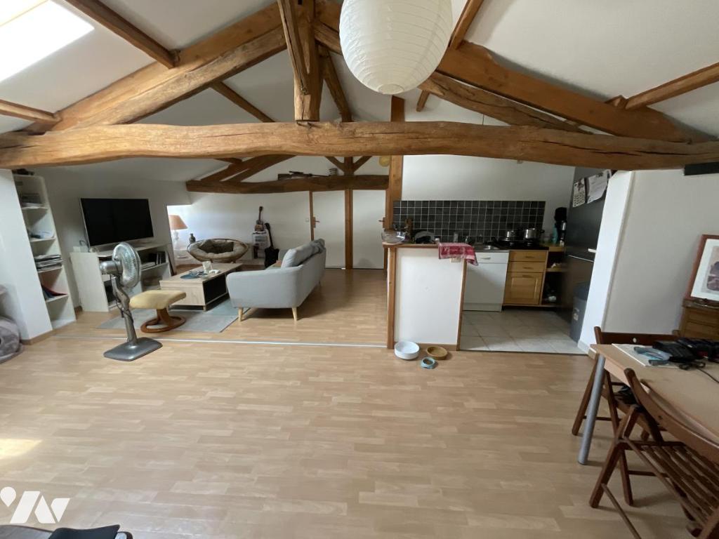 Appartement 2 (étage – actuellement loué) : entrée indépendante, séjour avec cuisine, salle d'eau avec WC, 2 chambres, grenier, jardin et places de stationnement devant la maison.