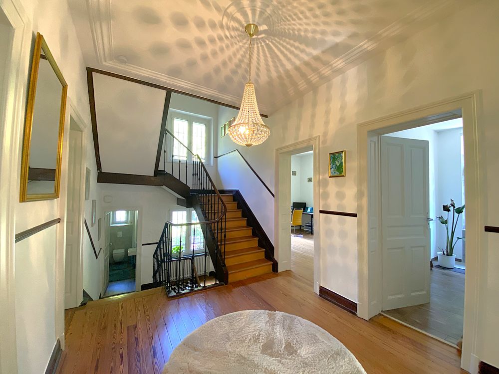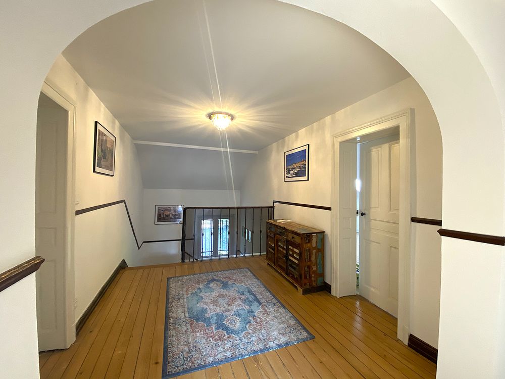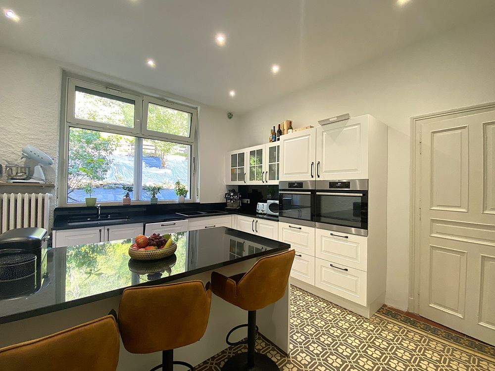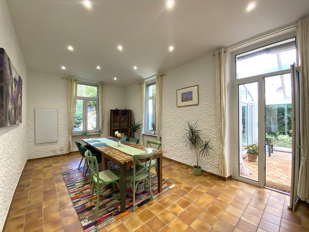 Cette villa Art Nouveau récemment rénovée, datant de 1926, avec une surface de terrain de 3 976 m² et une surface habitable de 343 m², séduit par son emplacement unique et calme à Petite-Rosselle (FR).Depuis l'entrée, vous accédez au séjour lumineux et spacieux, doté d'un poêle en faïence et de moulures au plafond. La salle à manger claire offre un accès direct à la véranda. La cuisine, équipée de carreaux Art Nouveau d'époque et d'une nouvelle cuisine aménagée, bénéficie d'une grande réserve attenante. À ce niveau, ainsi qu'au demi-étage menant au premier étage, se trouvent chacun un WC pour invités avec lavabo.
