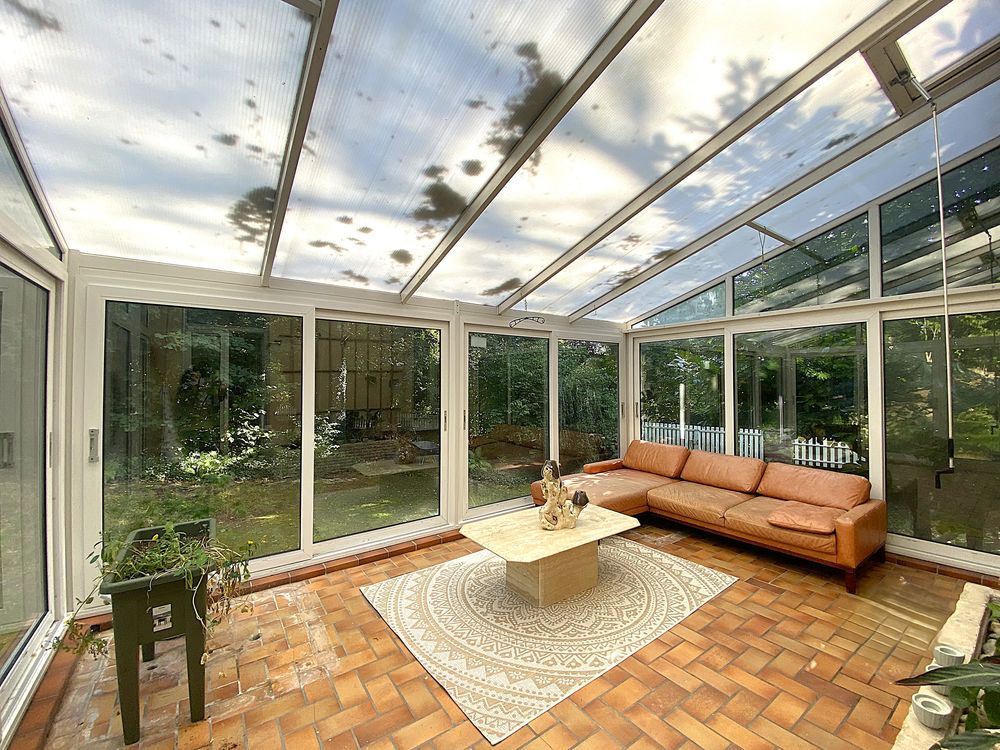 À côté de la maison, avec un accès séparé, se trouve le garage. Le vaste jardin est aménagé sur deux niveaux, le niveau supérieur offrant un pavillon romantique avec une superbe vue.