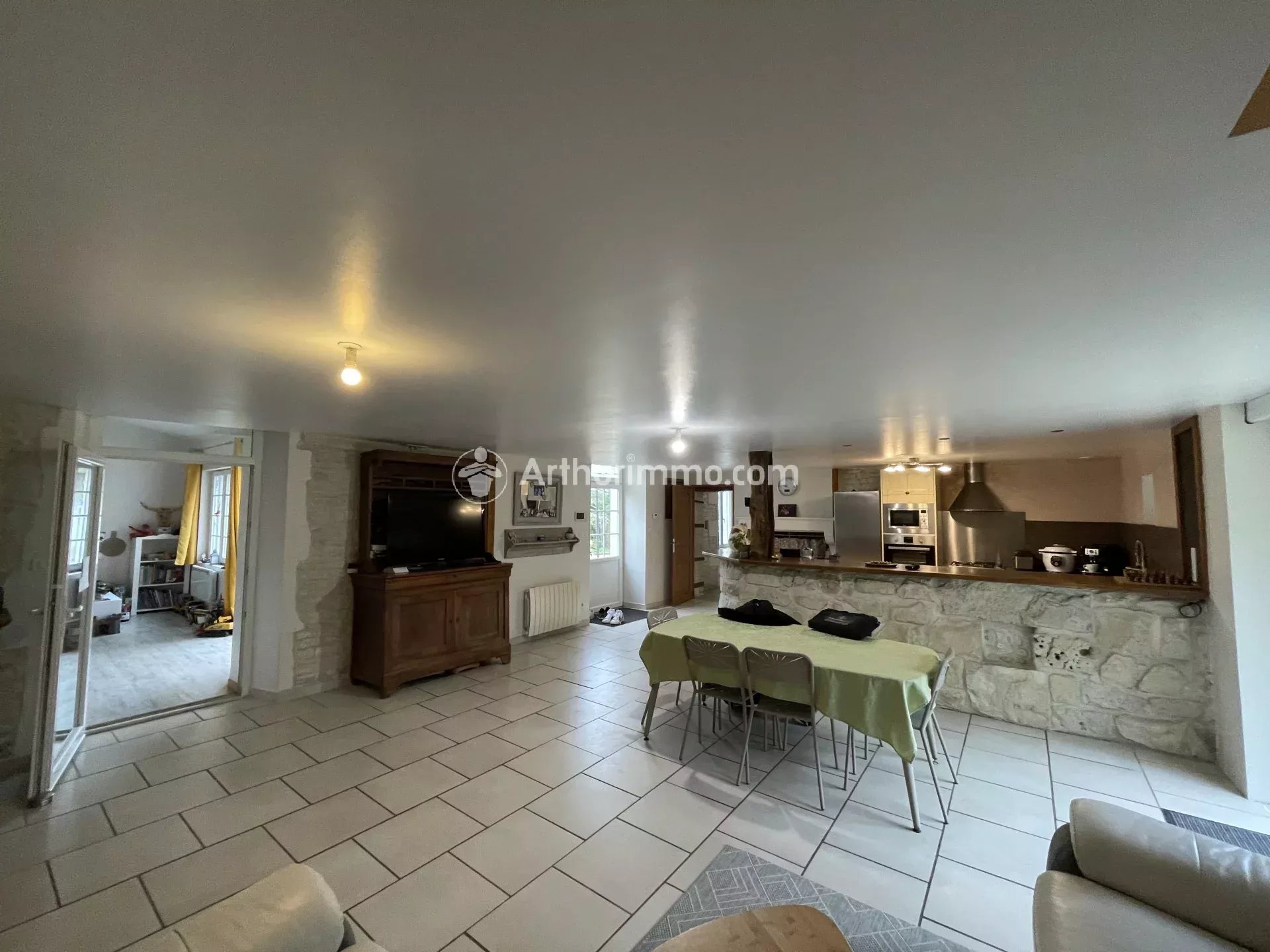 La maison d'une superficie habitable d'environ 180 m2 est située dans un lieu dit au calme, elle comprend : cuisine ouverte sur salle à manger avec insert, salon, buanderie, WC, chambre de 17m2 au RDC.