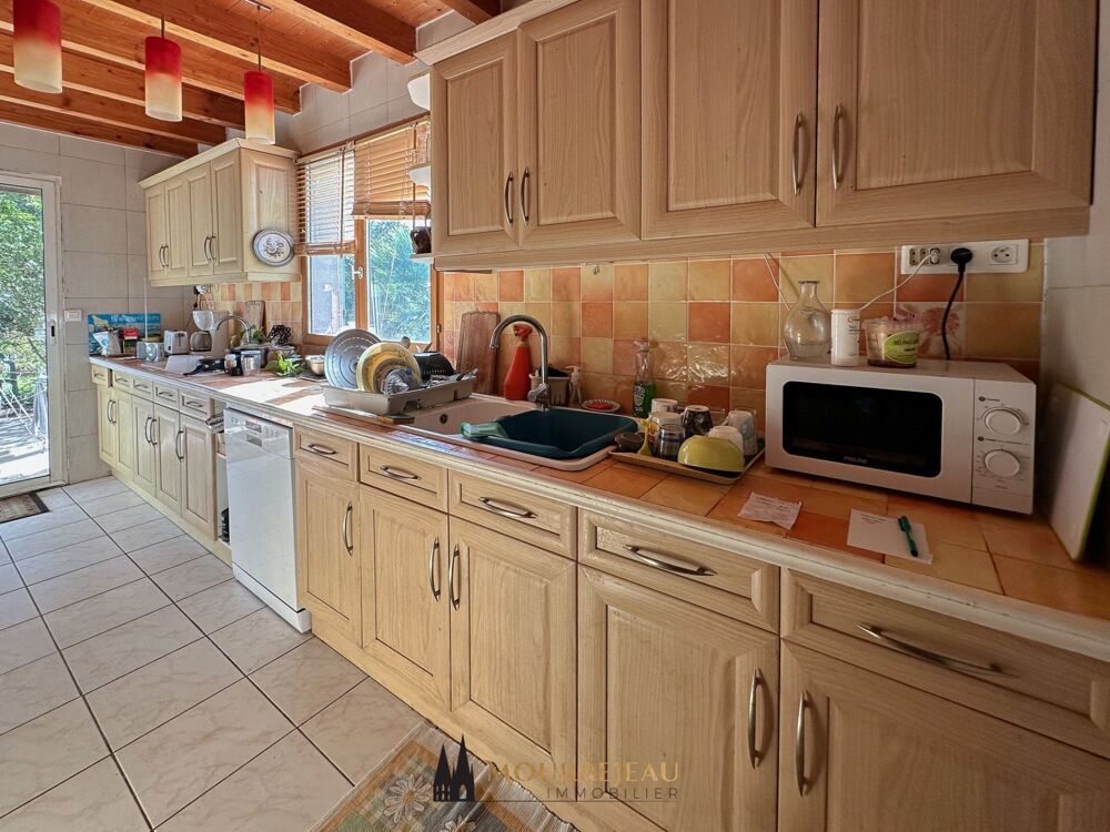 L'espace de vie se compose d'une cuisine bien équipée avec son cellier, d'un salon double disposant d'un poêle à granulés, d'une véranda et d'une salle à manger.