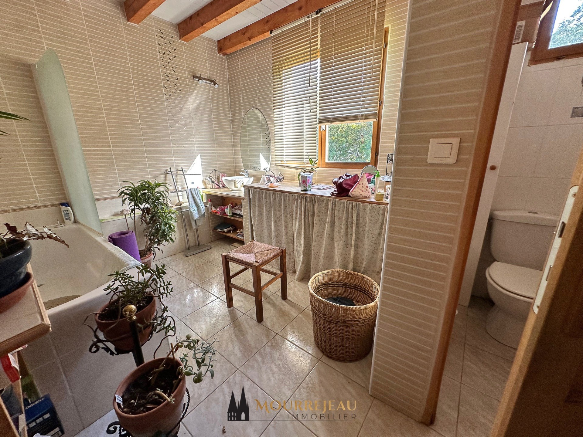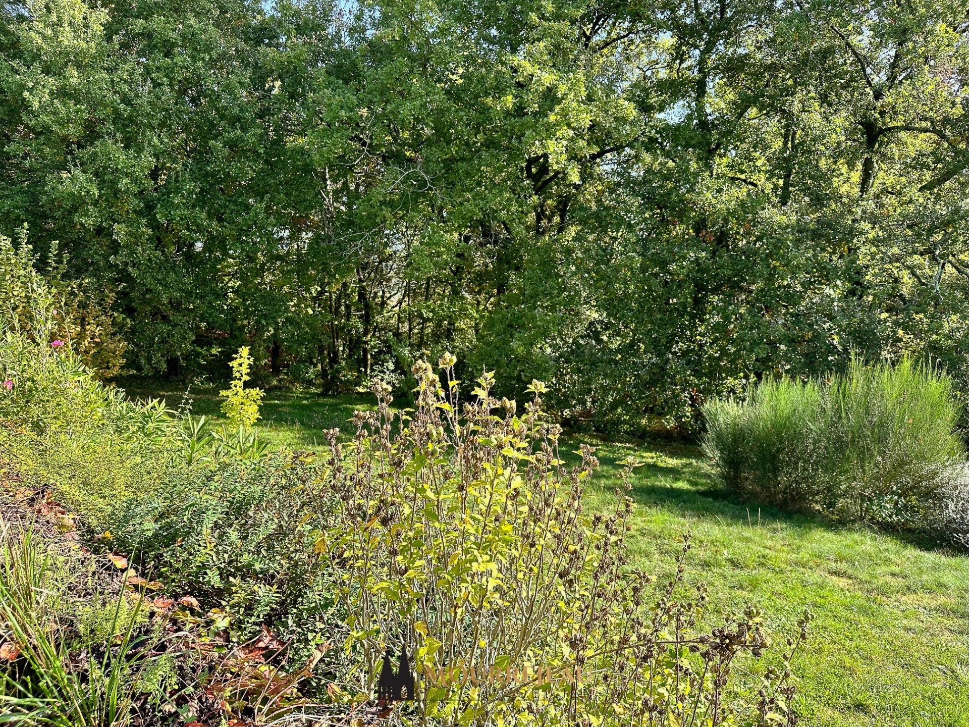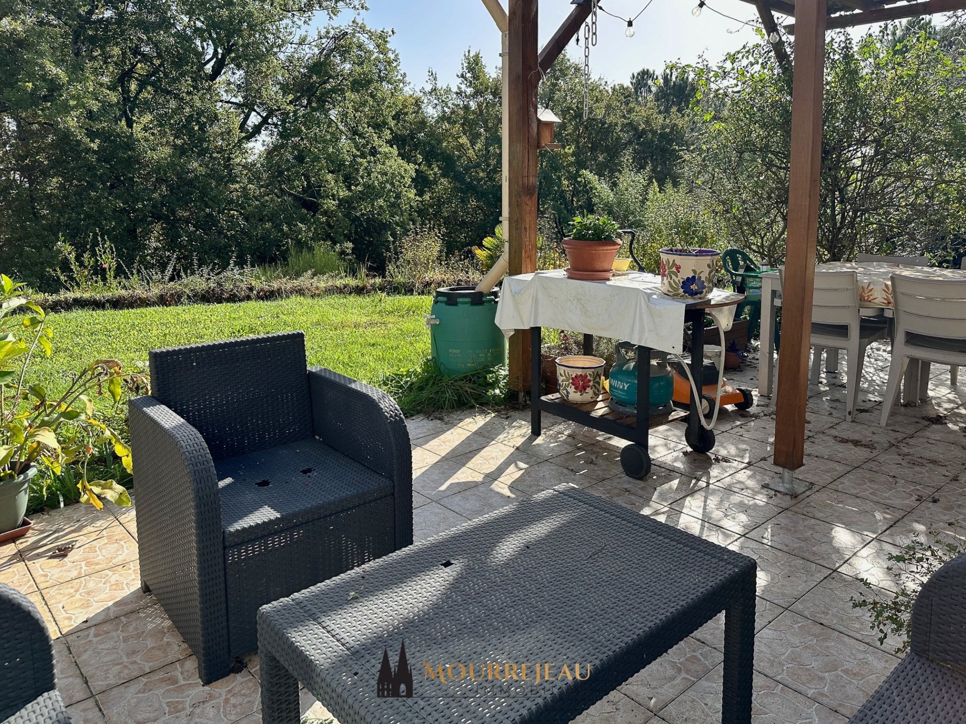 La grande terrasse de 32 m², en partie couverte, s'ouvre sur jardin doté d'un petit bois qui présente un beau potentiel.