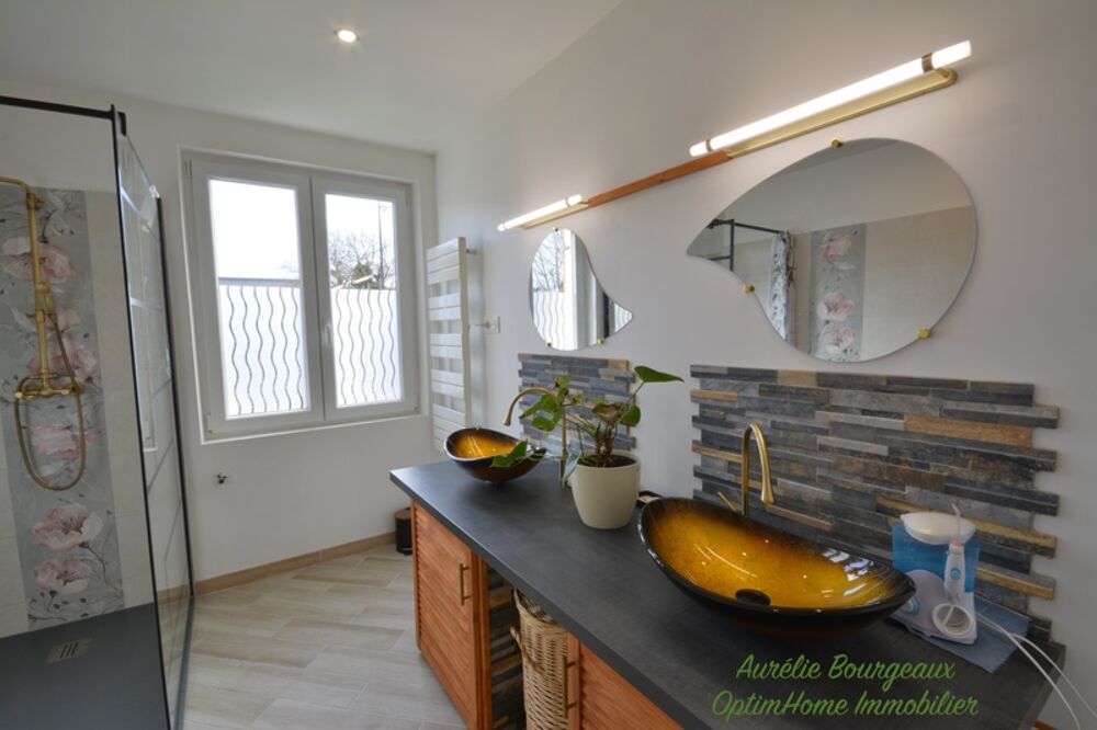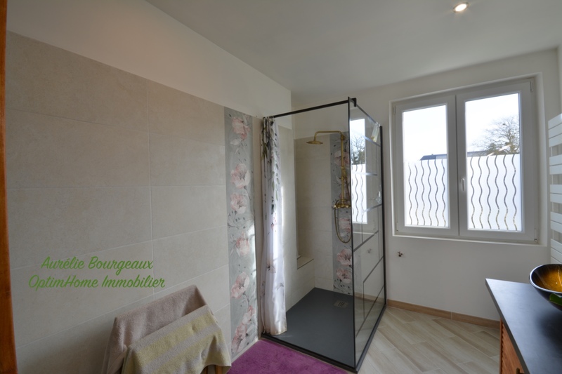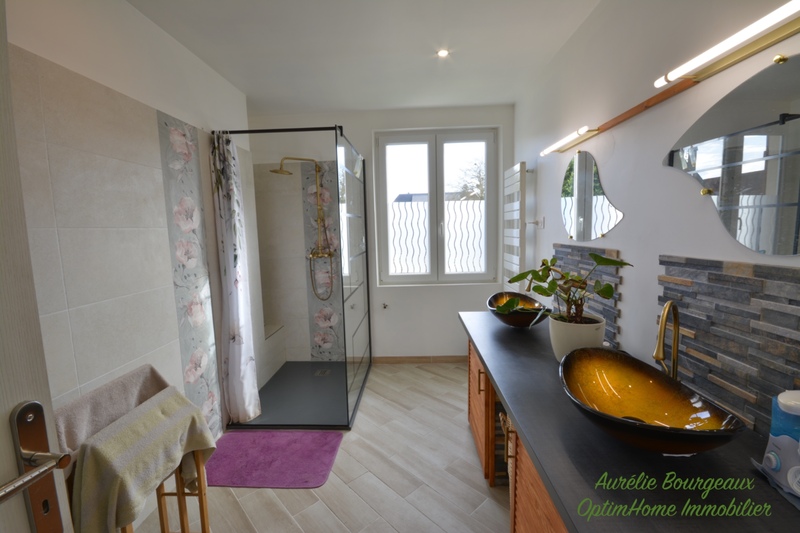 Le rez-de-chaussée dispose également d'une salle d'eau avec douche à l'italienne et meuble double vasques, d'une chambre parquetée, d'un WC séparé et d'une buanderie.