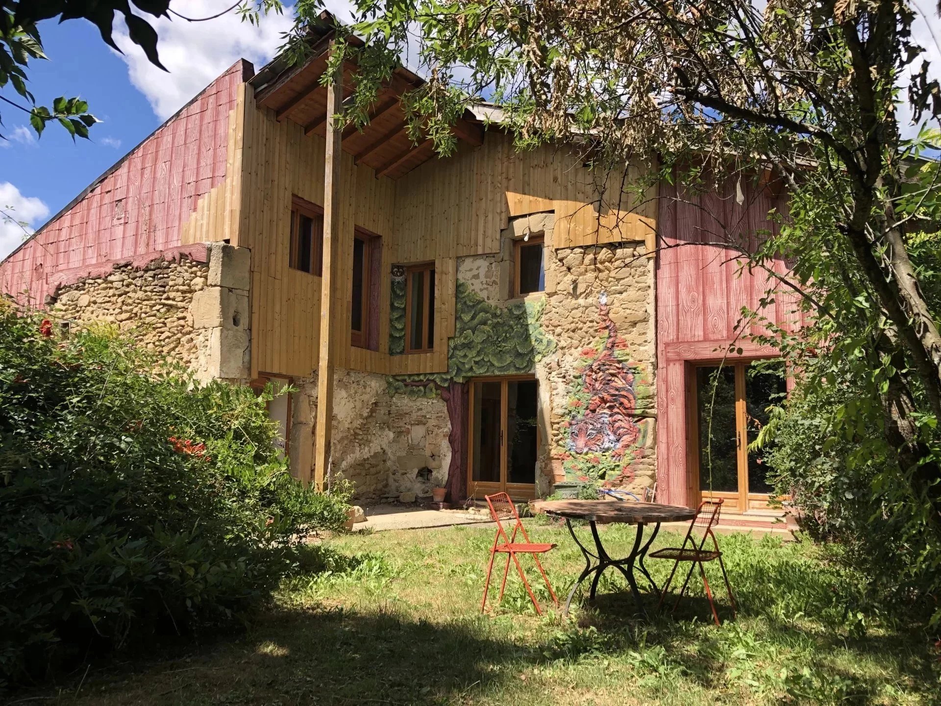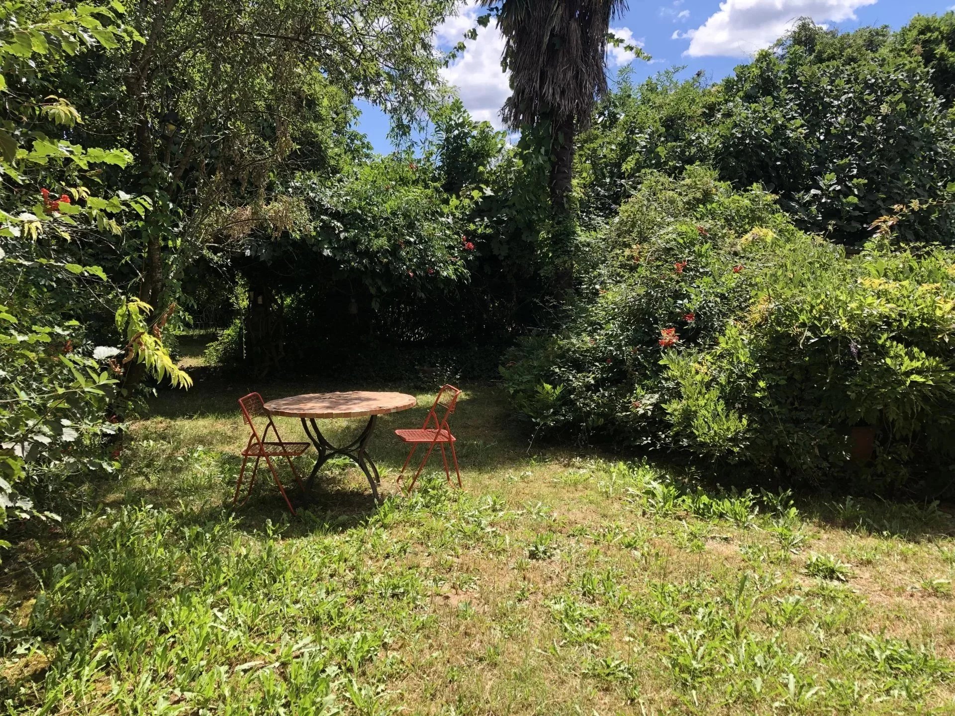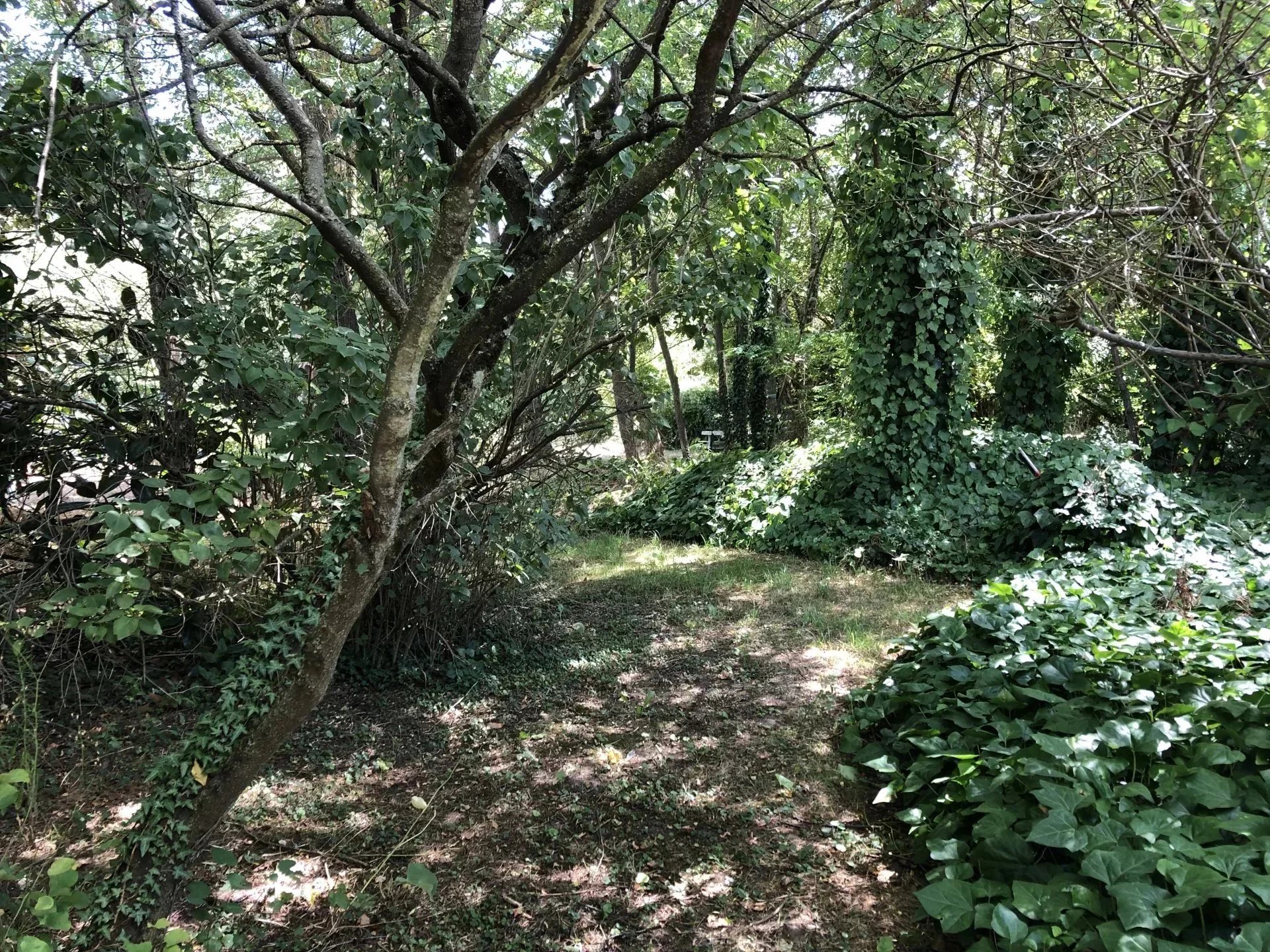 Dans un cadre bucolique avec un terrain arboré et piscinable, assainissement par fosse septique à remettre aux normes.