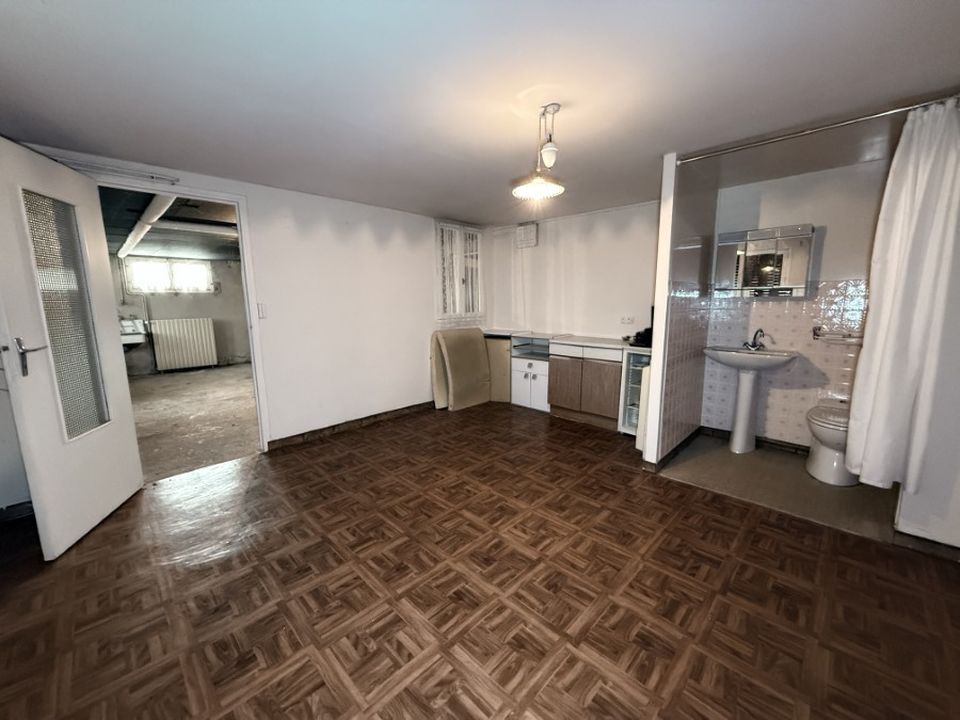 Au sous-sol, garage, 1 chambre avec coin salle de bain, WC