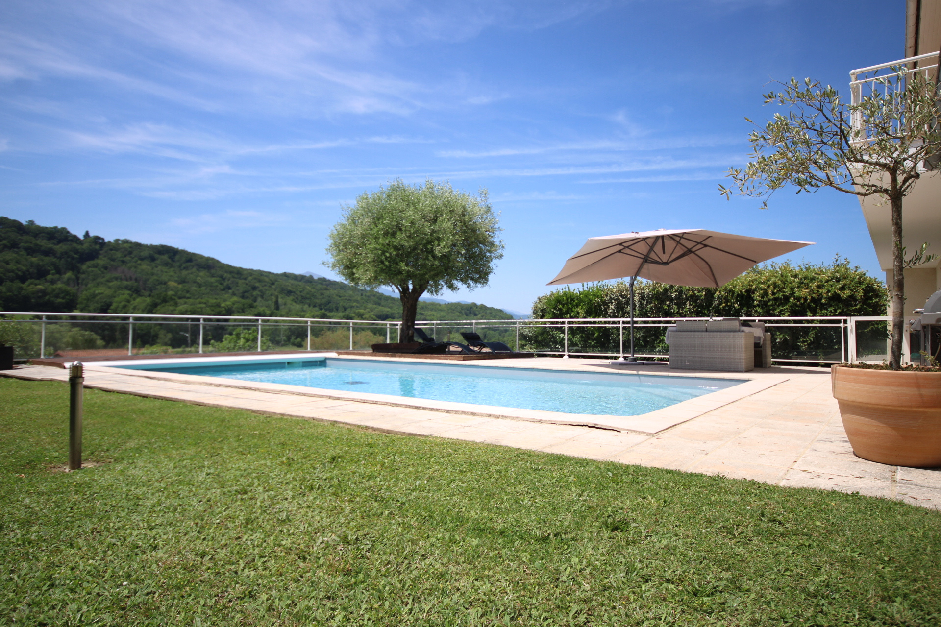 RDC : Hall d'entrée, 1 appartement avec salon/salle à manger/cuisine équipée donnant sur la piscine et accès terrasse, 1 chambre, 1 salle d'eau, toilettes, 1 espace bureau ou salle de sport. Garage voiture.