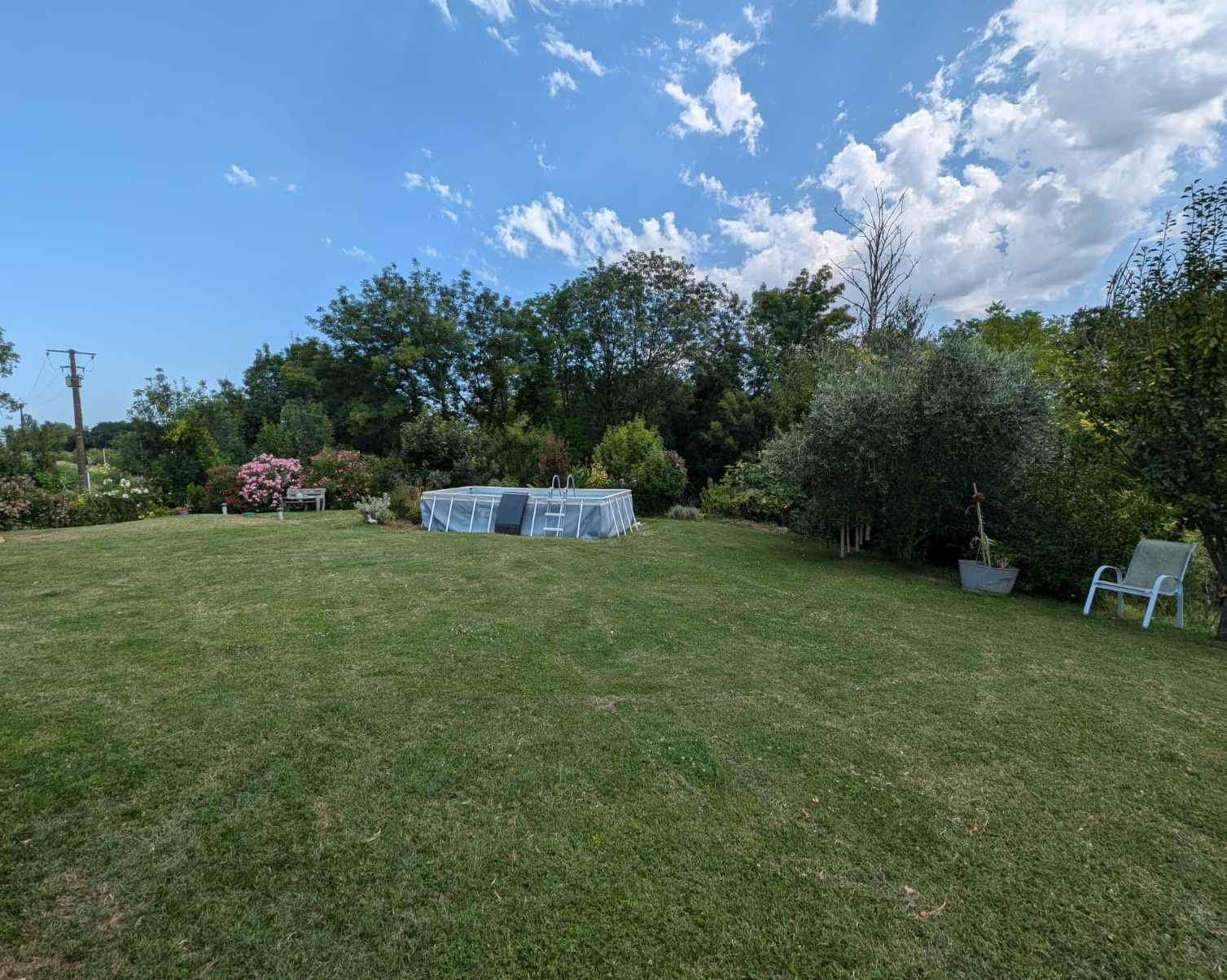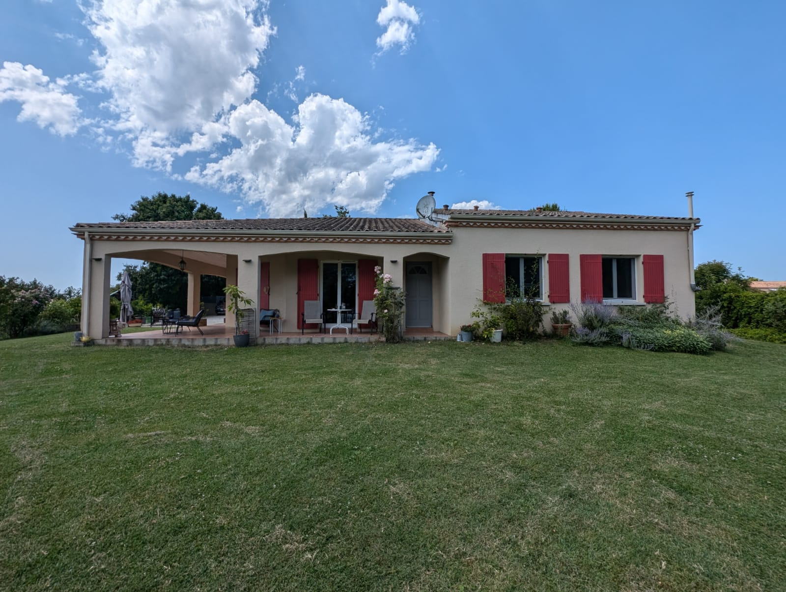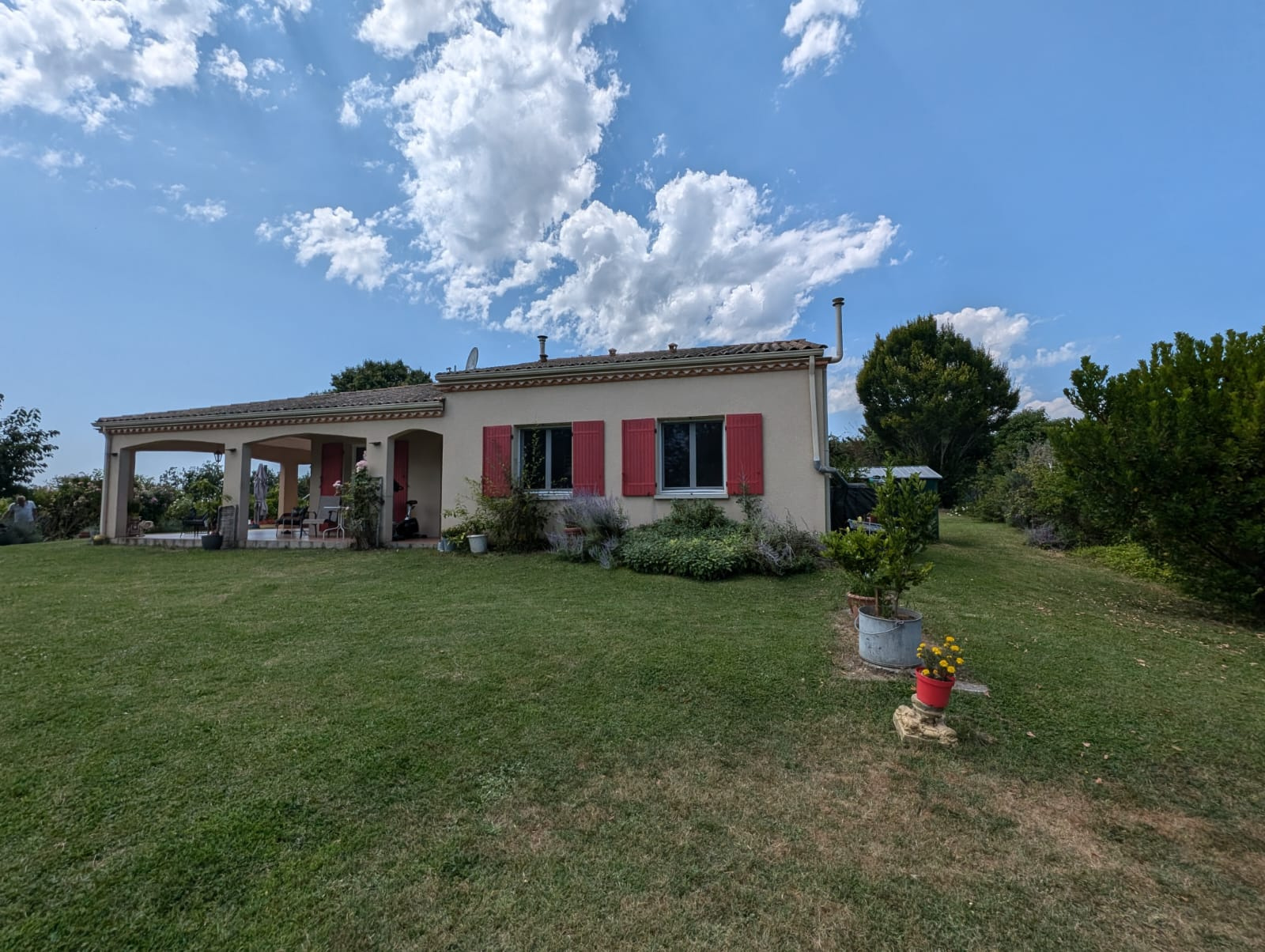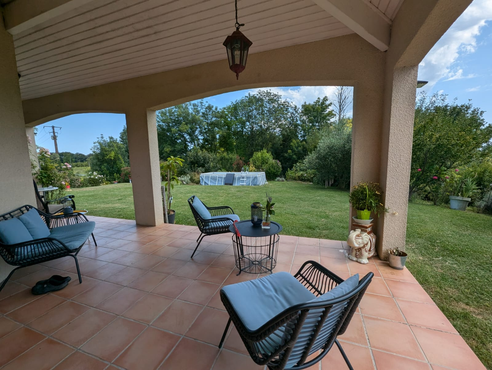 A l'extérieur, vous pourrez profiter d'une belle terrasse couverte donnant sur un terrain arboré de 1758m2 avec sa piscine hors sol.