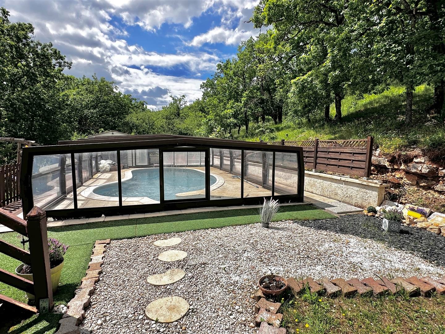 Implantée sur un beau parc arboré de 1796m², vous serez séduits par sa véranda et sa piscine couverte.