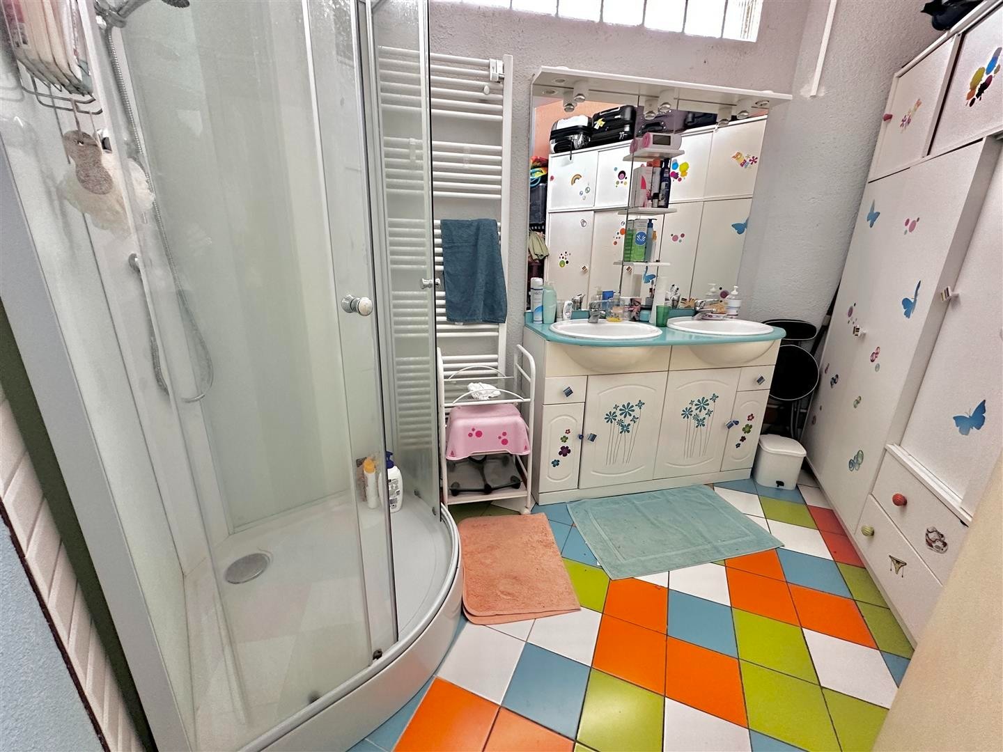 La maison est bâtie sur 3 niveaux, avec en rez-de-chaussée une partie garage / cave.