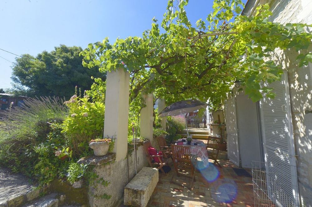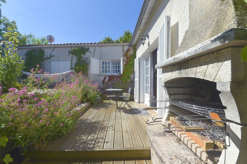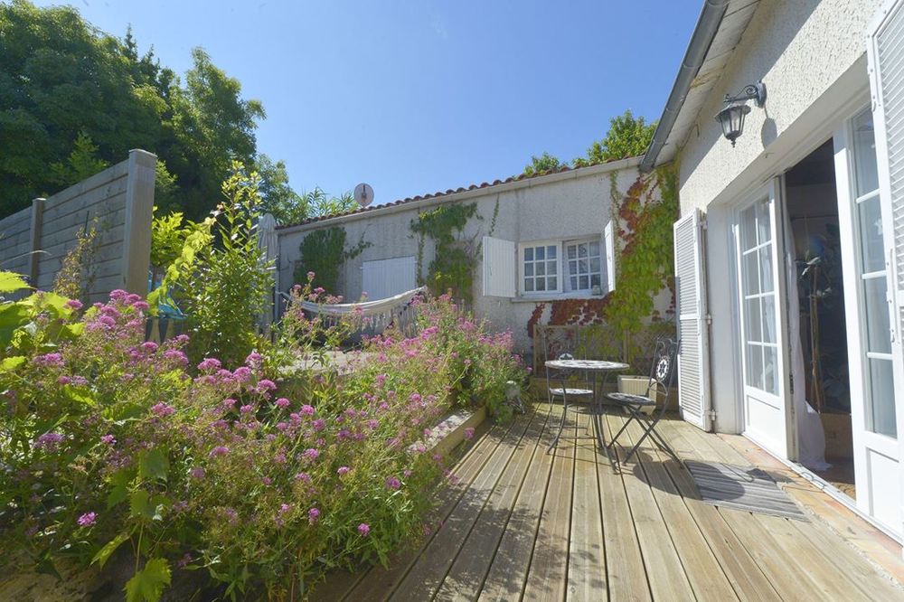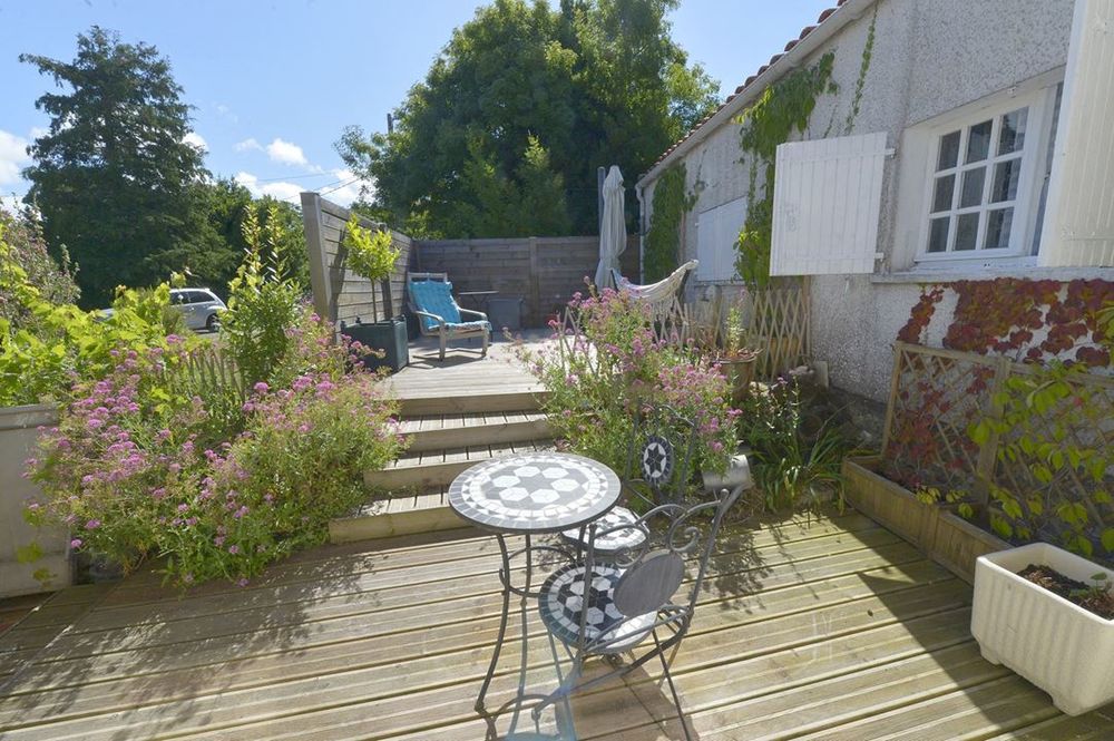 Vous pourrez profiter d'une grande terrasse qui longe la maison, comprenant une partie en bois pour le solarium et un carport végétalisé recouvert d'une vigne, offrant ainsi un agréable coin dinatoire ombragé.