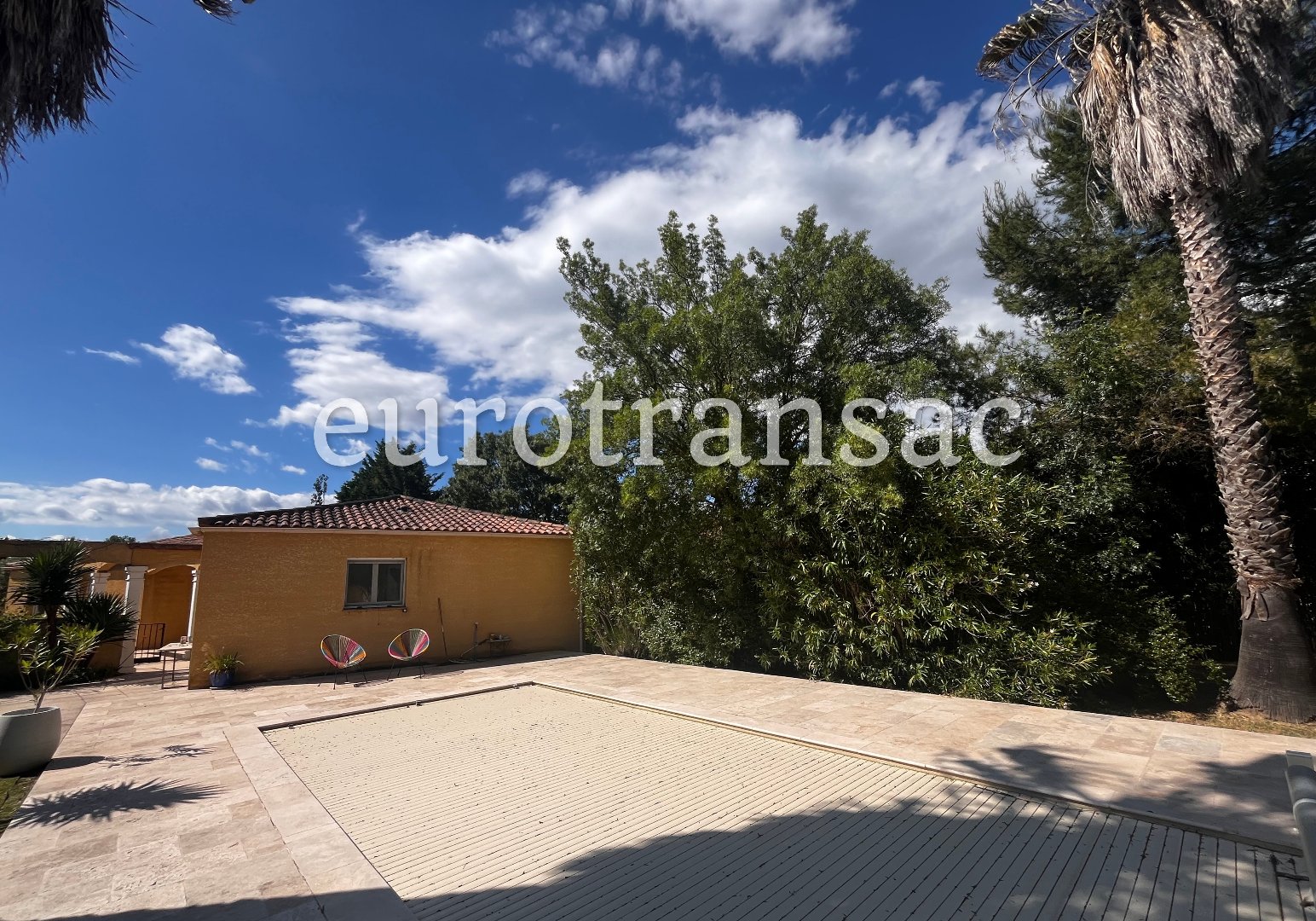 La piscine, avec son revêtement en travertin, complète parfaitement l'ensemble extérieur.