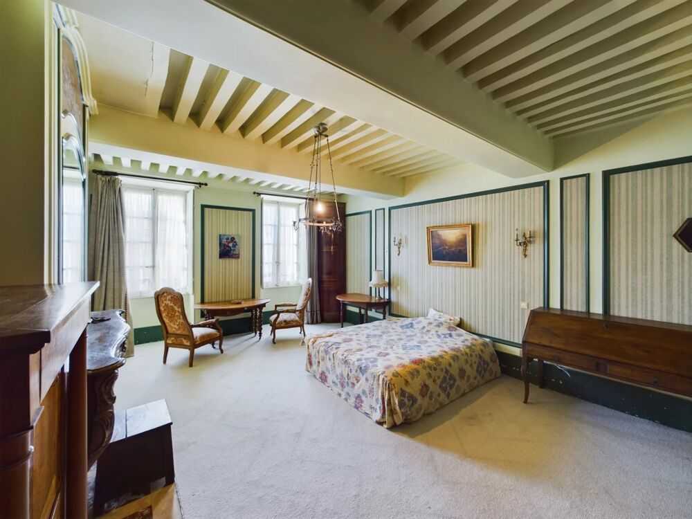 A l'étage grand palier desservant quatre chambres, une première chambre avec plafond à la française, sol moquette sur parquet, deux fenêtres sur rue, un placard réduit à usage de dressing et une salle de bains attenante, plafond à la française, une seconde chambre, plafond à