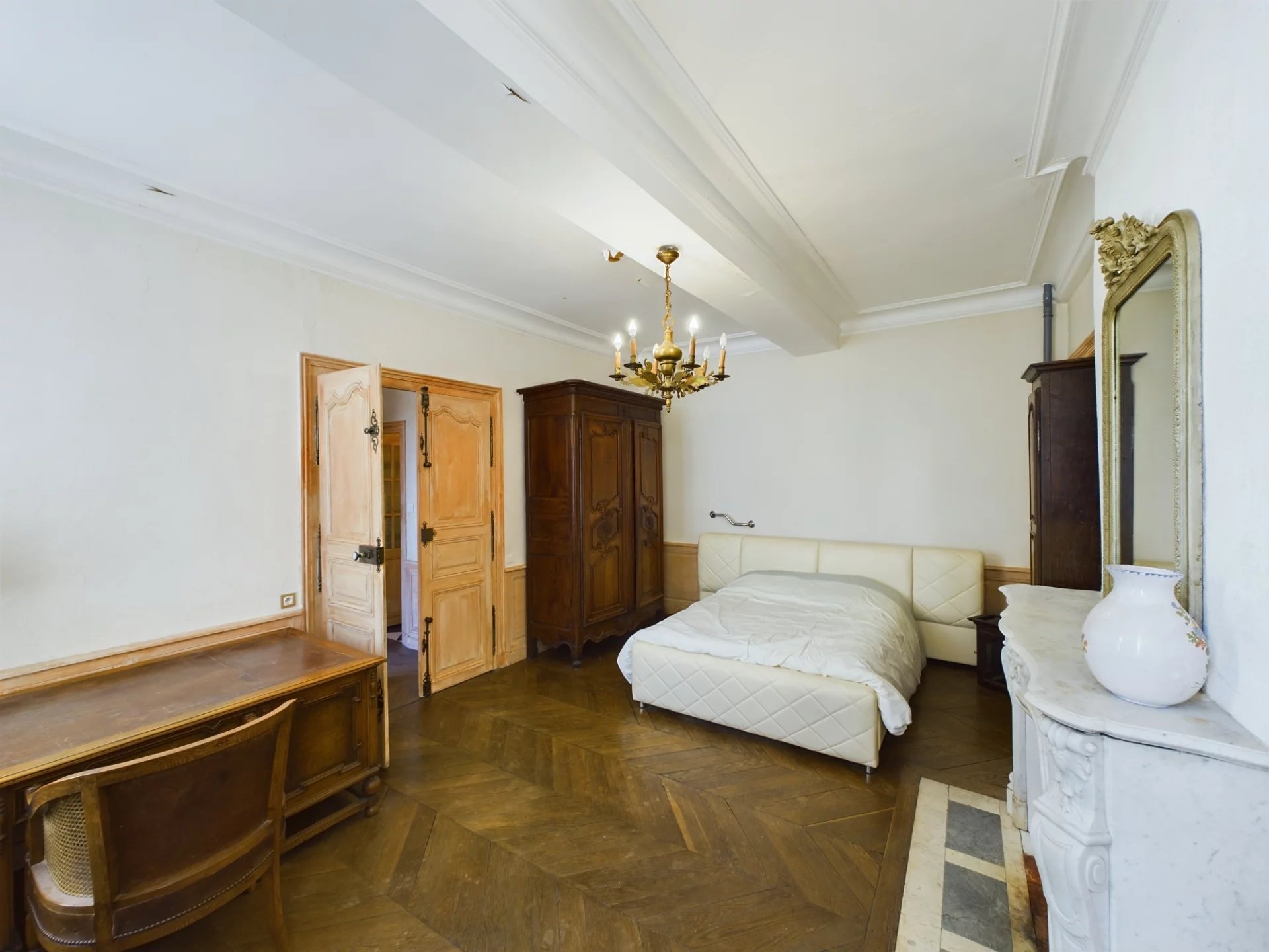 caisson, une cheminée marbre, sol moquette sur parquet, deux fenêtres sur rue, une troisième chambre, plafond à la française peint, moquette sur parquet, cheminée de style avec trumeau, deux fenêtres sur rue et une salle d'eau attenante et enfin une quatrième chambre, sol moquette sur parquet, plafond plâtre, cheminée de style Louis XV avec trumeau, une fenêtre sur cour, et un cabinet de toilette attenant avec fenêtre sur cour.