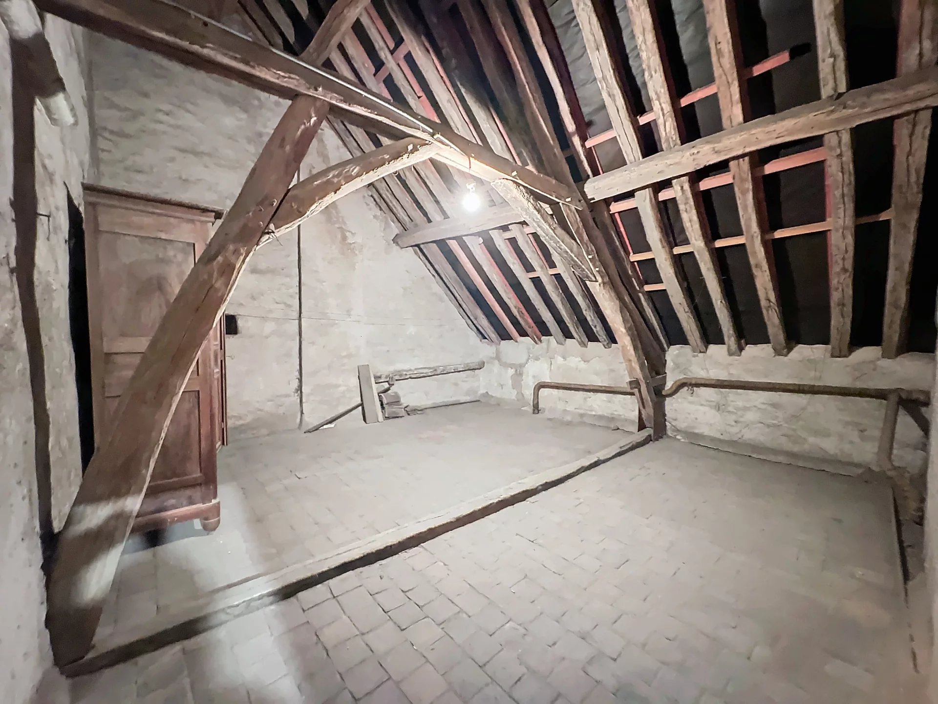 Au deuxième étage: un palier desservant le grenier aménageable et une pièce annexe mansardée, sol parquet, murs, plafond et rampant en lambris, fenêtre lucarne sur cour.