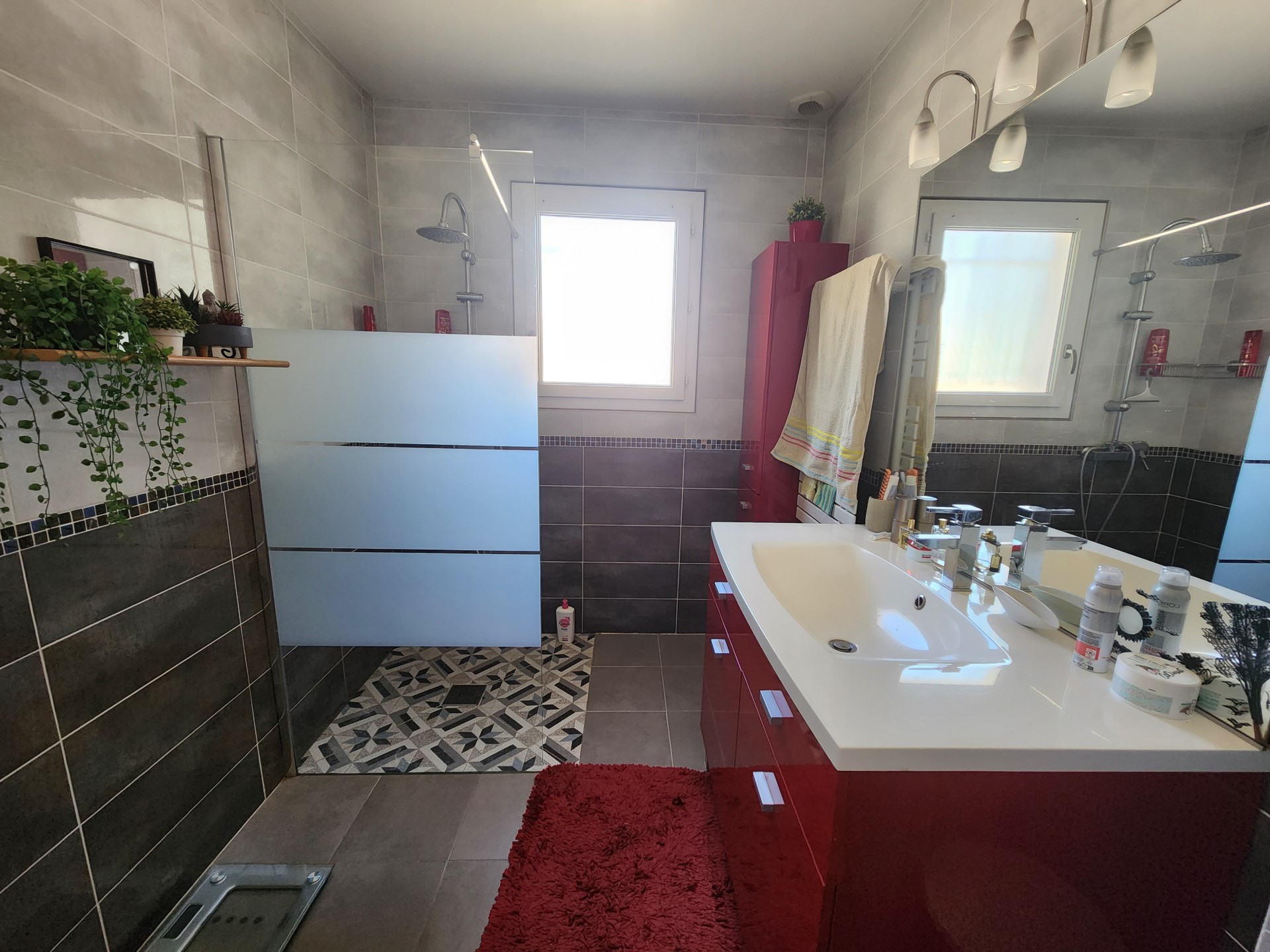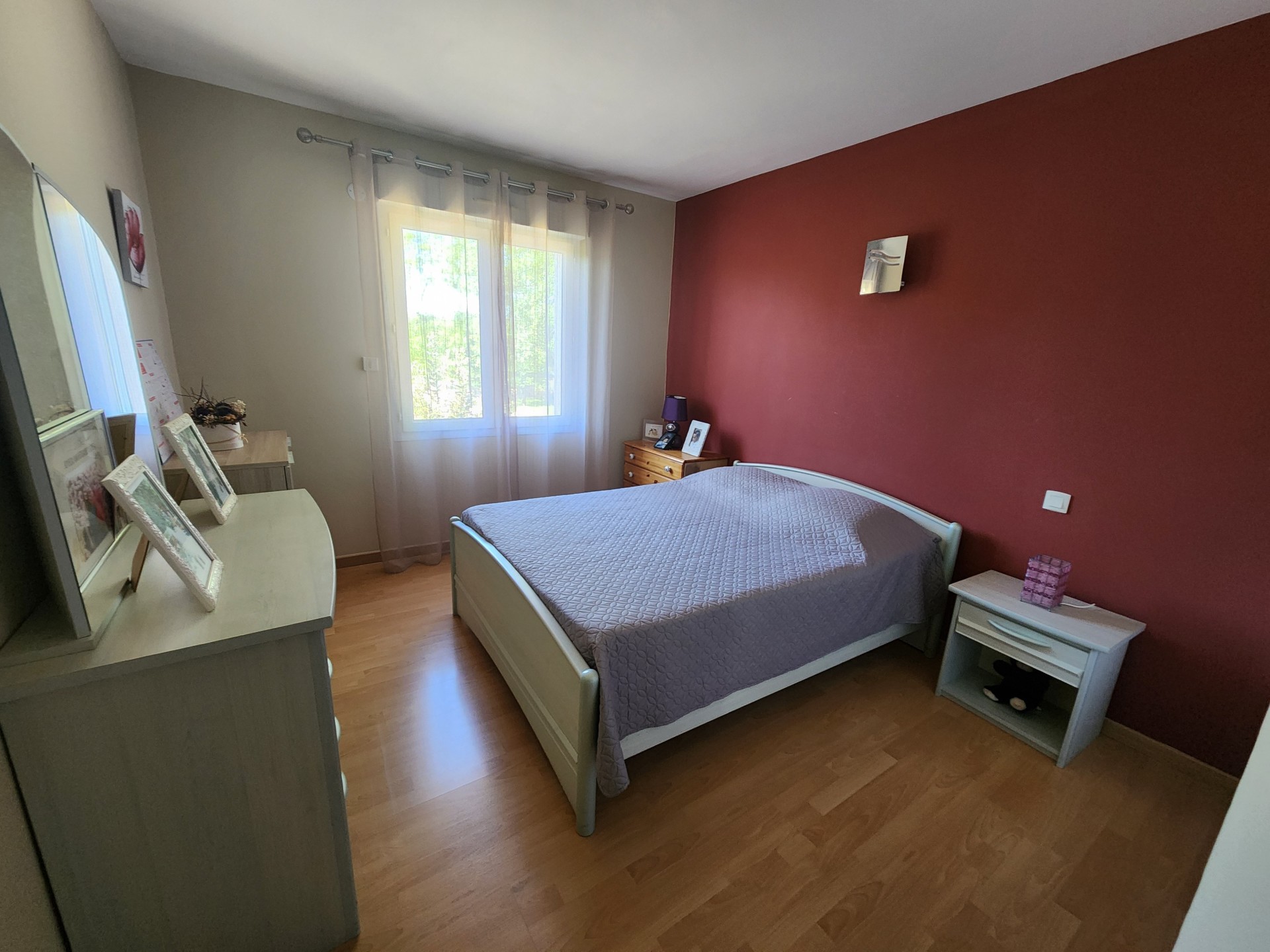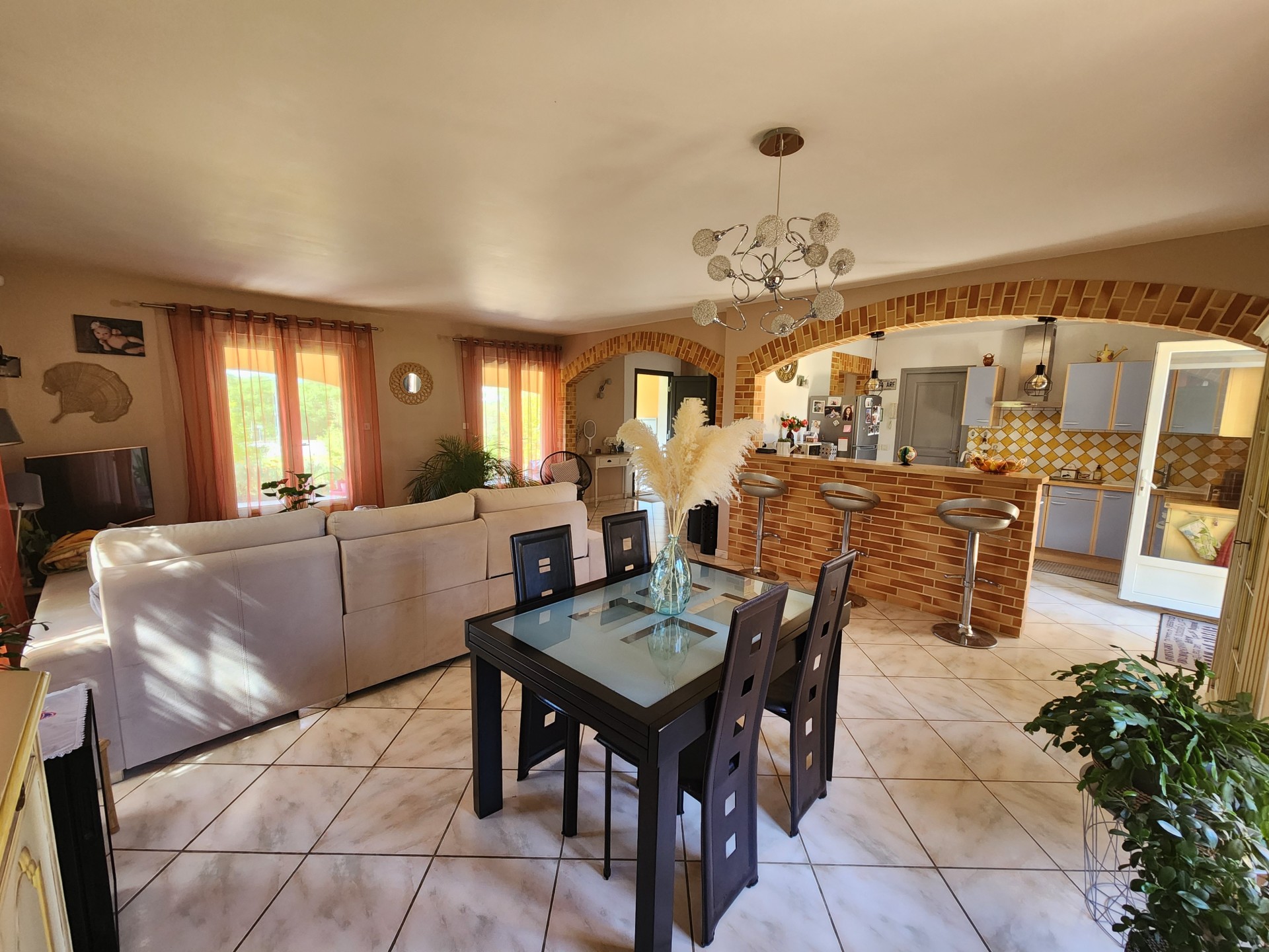 Elle est composée d'une grande entrée, d'un cellier/buanderie, d'une cuisine aménagée et équipée en partie ouverte sur un salon/salle à manger donnant sur 2 terrasses dont une couverte, d'un large dégagement avec rangements, de 3 chambres, d'une salle d'eau, d'un WC indépendant.