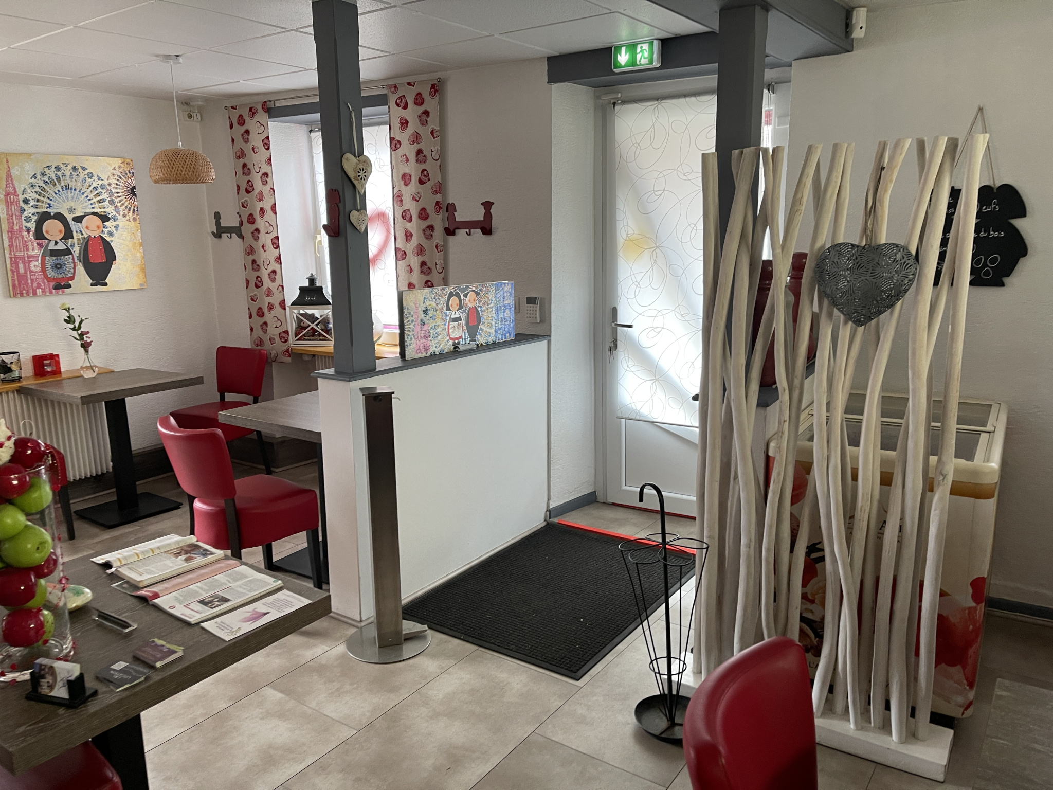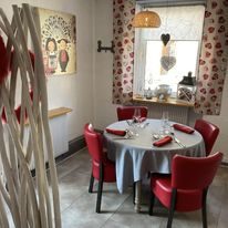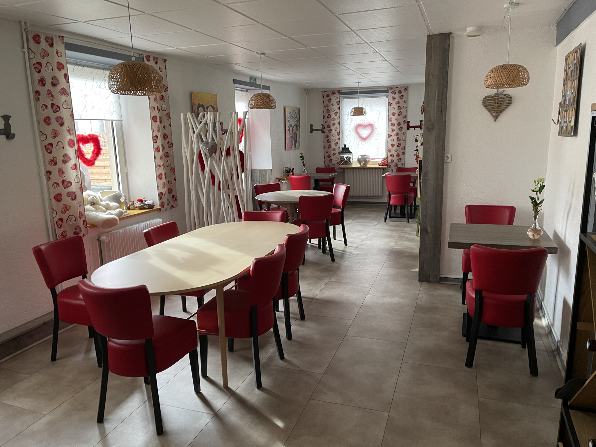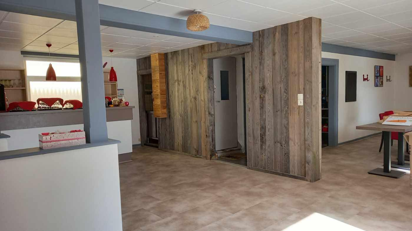 Au rez-de-chaussée : Un local commercial sur un plateau d'environ 105 m2 avec une grande salle chaleureuse et comptoir, cuisine et sanitaire. Rez de chaussée accessible aux personnes à mobilité réduite.