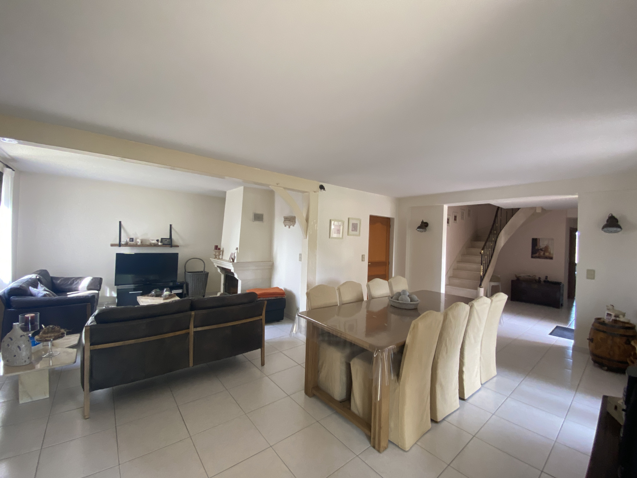 1 salon très spacieux avec une cheminée équipée d'un insert, offrant une vue imprenable sur le parc.