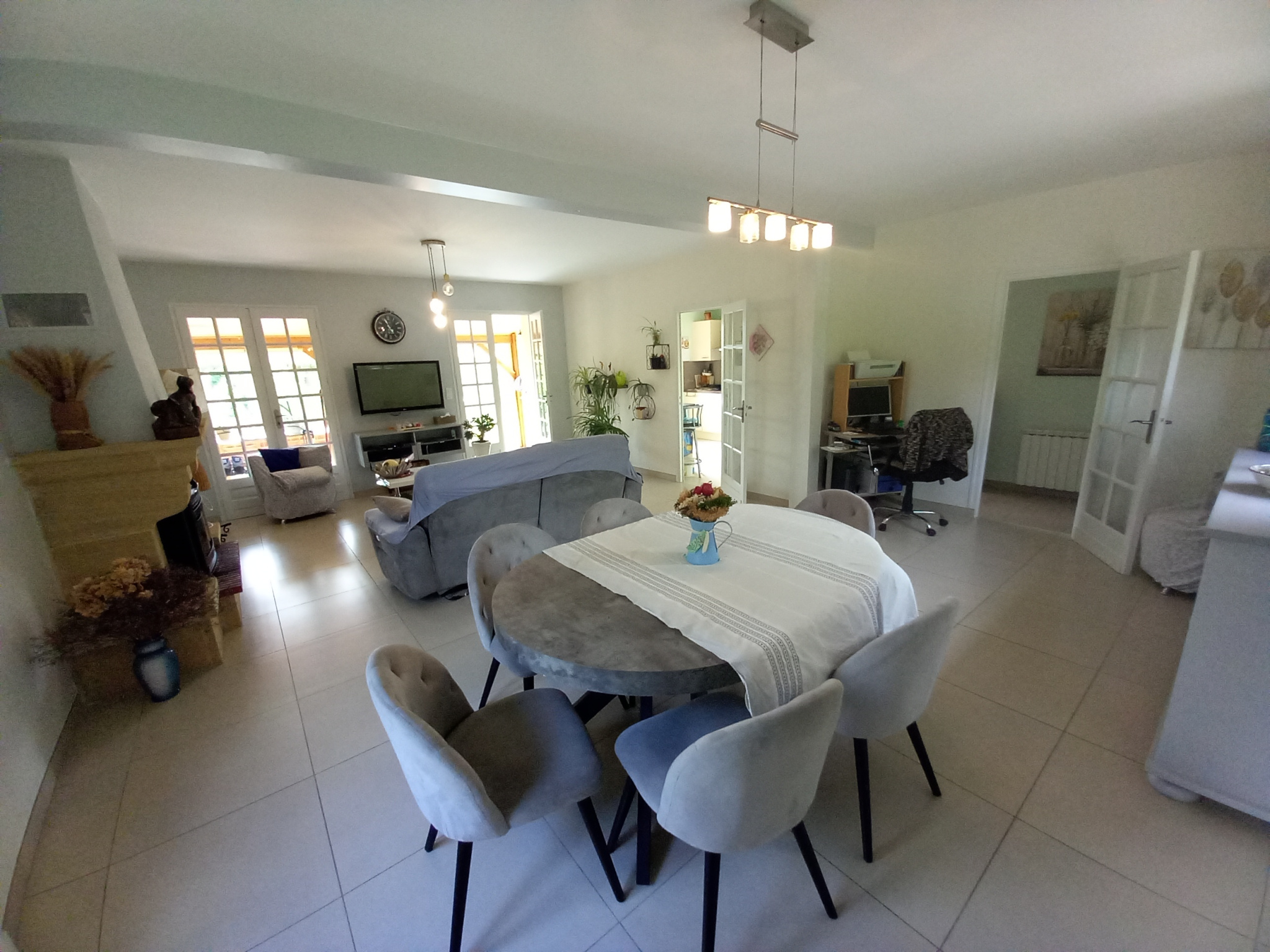 Un spacieux salon-séjour de 43 m2, lumineux, avec accès direct à une véranda offrant une vue imprenable sur le parc et la piscine