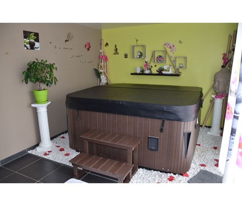 une pièce de 15,70m2 aménagée avec un SPA communique avec une terrasse carrelée, couverte et intime par des baies vitrées, et un cellier-buanderie de 9,50m2.