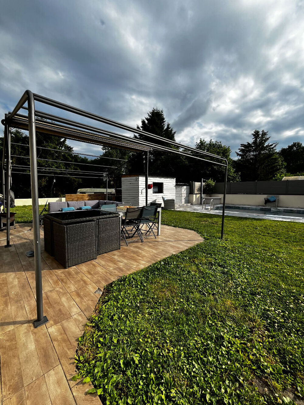 Une fois l'intérieur visité vous pourrez apprécier les travaux réalisés sur l'extérieur donnant sur un jardin avec potager, un terrain de pétanque et un espace cuisine extérieure.