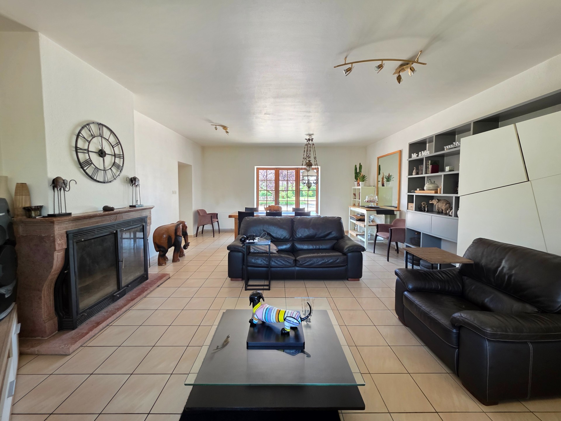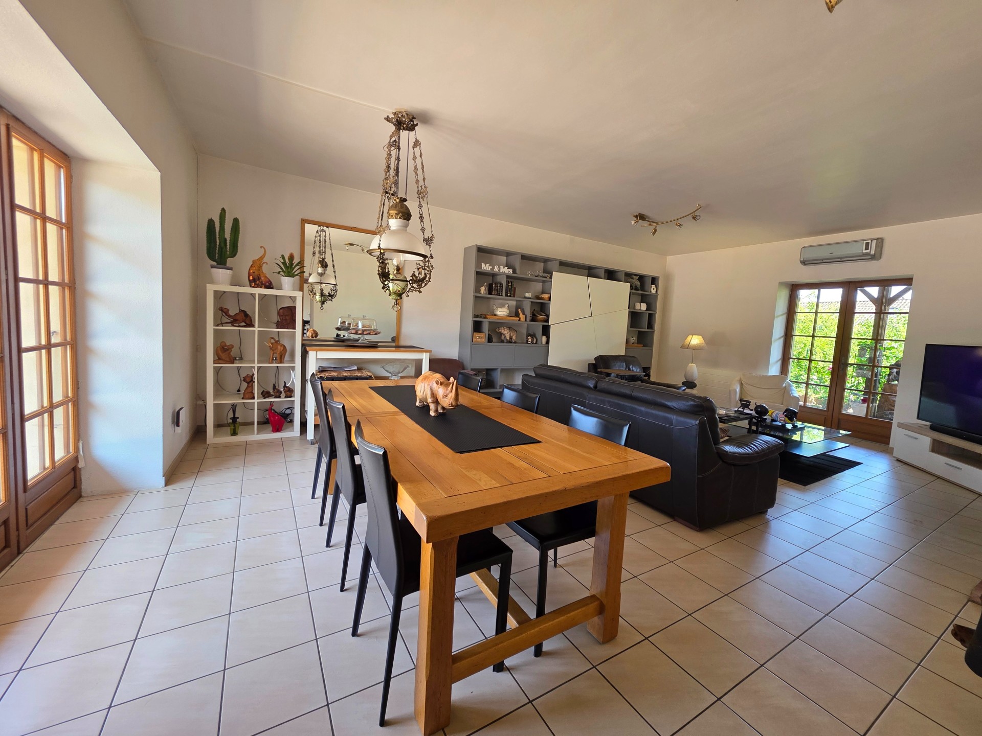 Le salon-séjour de 40 m², traversant, profite d'une belle lumière naturelle et de deux ouvertures vers le jardin, parfait pour une vie dedans-dehors.