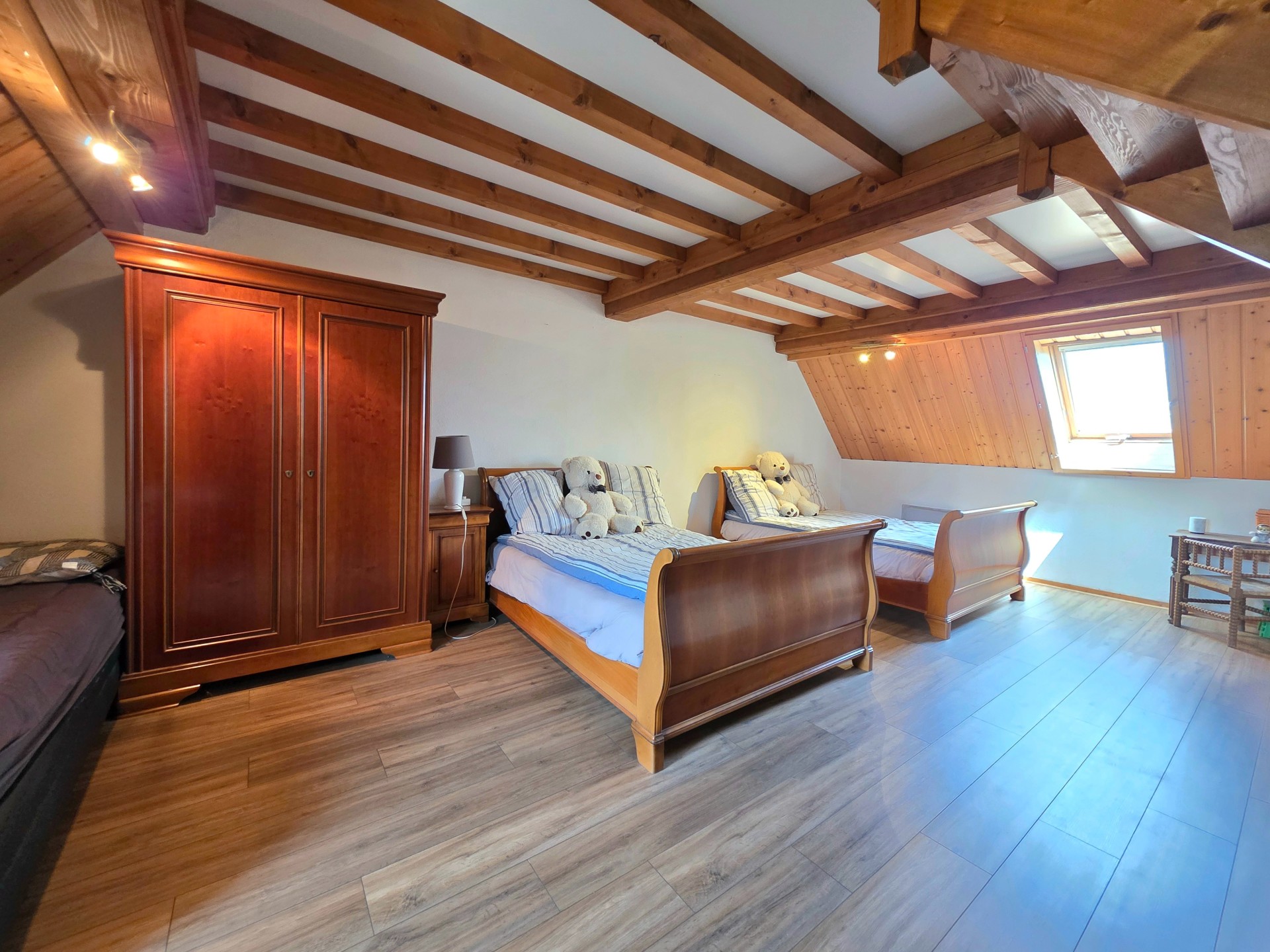 Depuis cette pièce, quelques marches mènent à un espace grenier surélevé, idéal comme coin jeux ou bureau.