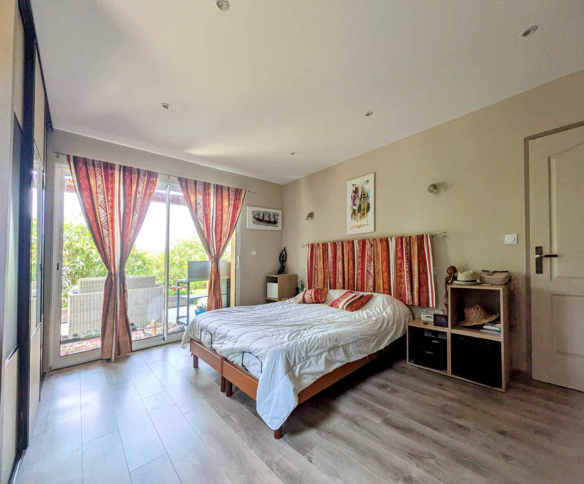 De larges baies vitrées s'ouvrent directement sur une grande terrasse ombragée.