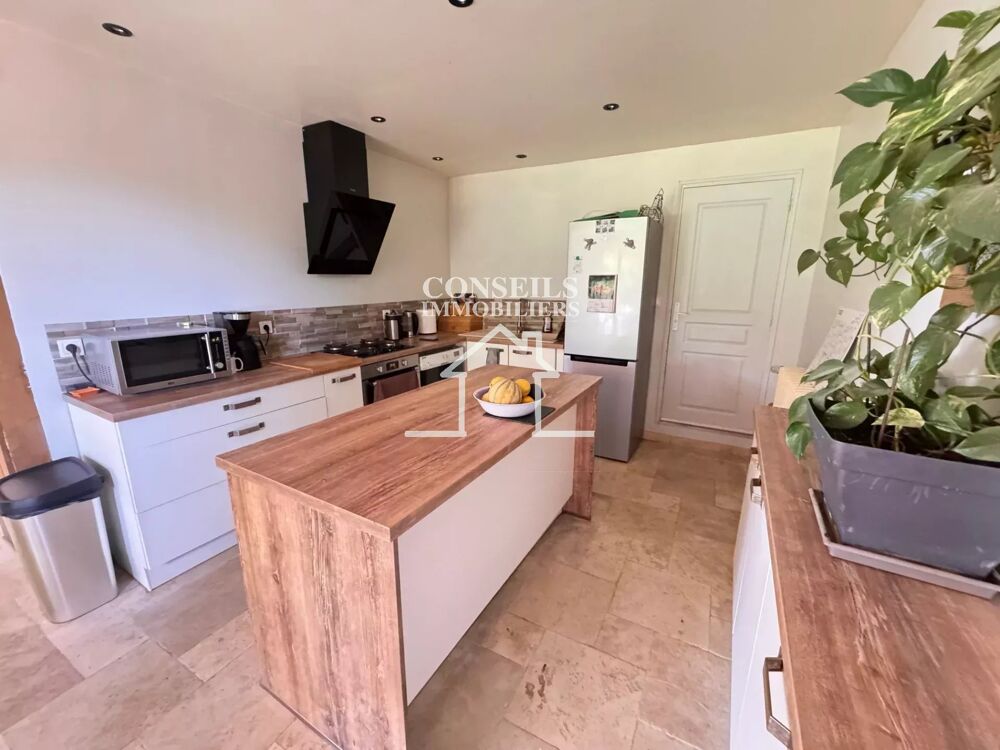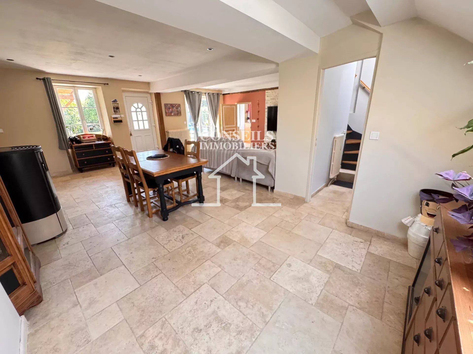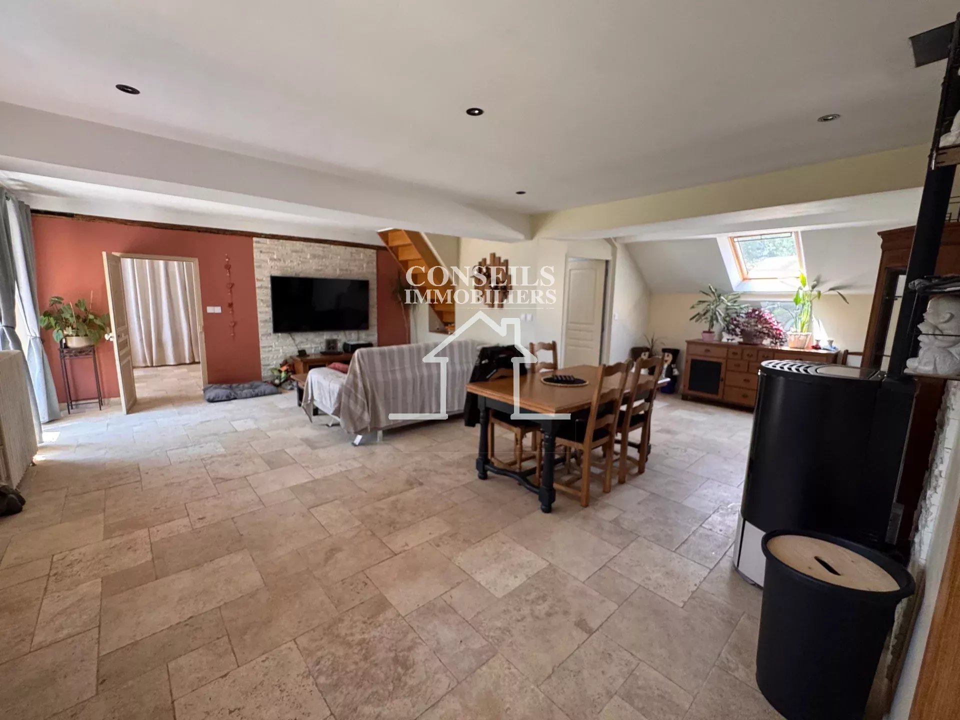 Le rez-de-chaussée vous enveloppe d'une atmosphère chaleureuse, portée par un poêle à pellets qui anime le vaste salon-séjour, attenant à une cuisine aménagée pensée pour les moments de partage.