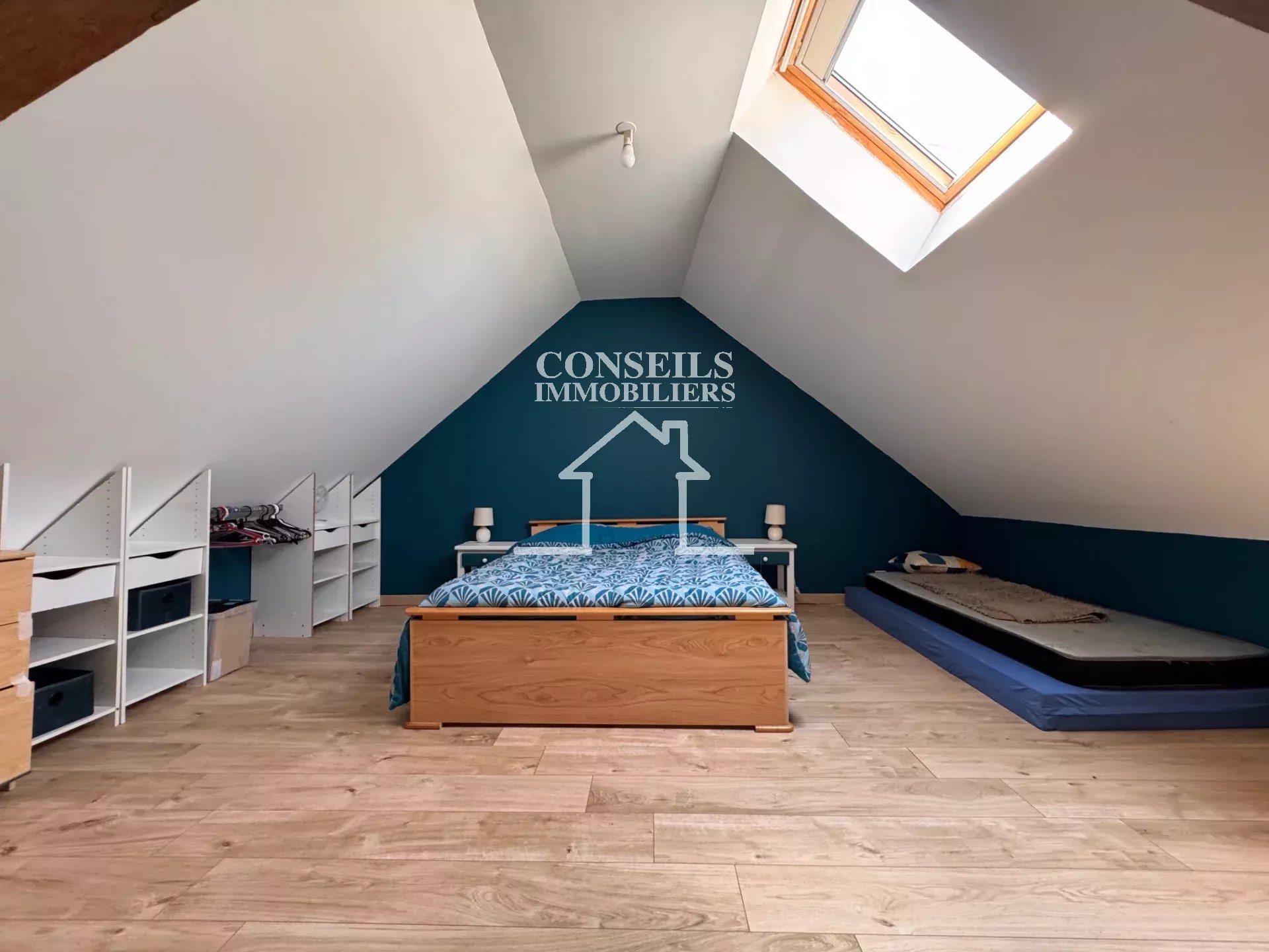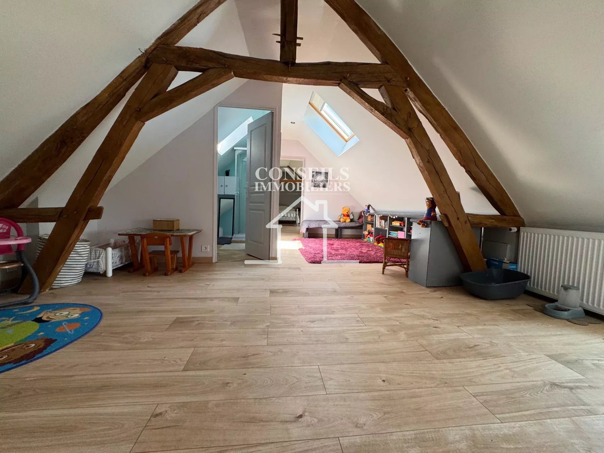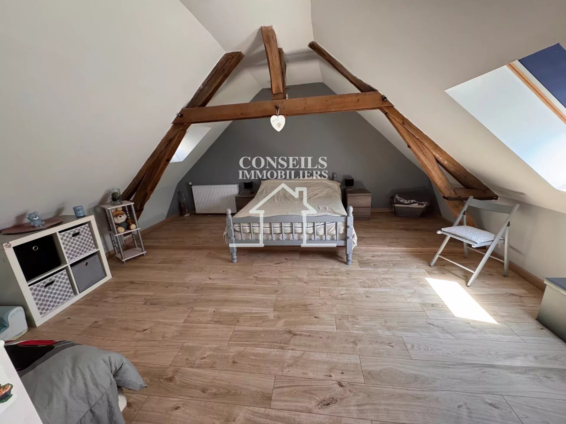 À l'étage, l'ambiance se prolonge avec un palier accueillant aménagé en salon, une salle d'eau avec WC, et deux chambres spacieuses baignées de lumière.
